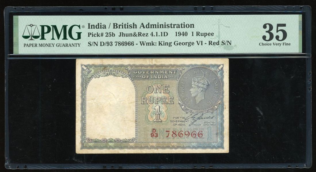 1940年印度1盧比, 紅字編號 D/93 786966. PMG 35, 罕見紅字編號