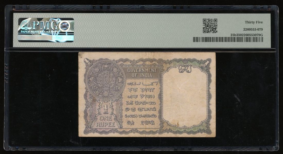 Government of India, 1 rupee, 1940, red serial number D/93 786966, (Pick 25b), PMG 35. Note this is the scarcer type with red serial number
