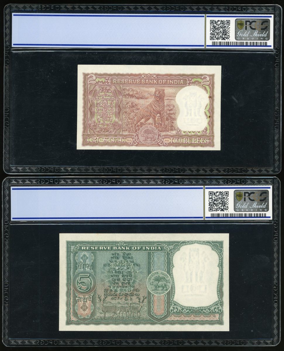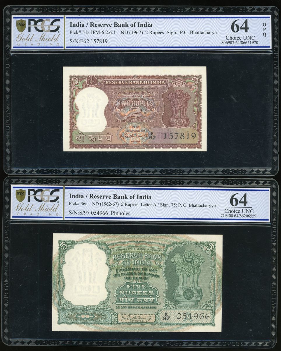 Reserve Bank of India, a pair of 2 rupees and 5 rupees, ND (1962-67), serial numbers S/97 054966 and E62 157819, (Pick 51a and 36a), graded PCGS Gold Shield 64OPQ and 64(Pinholes) respectively (2).