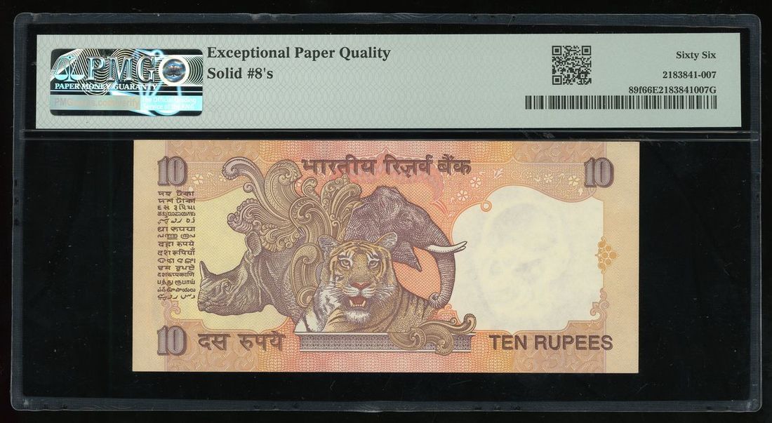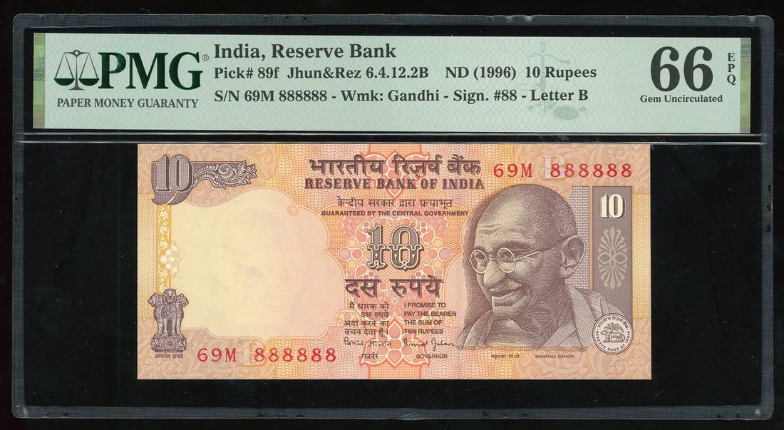 Reserve Bank of India, 10 rupees, ND (1996), solid number 69M 888888, (Pick 89f), PMG 66EPQ. Solid 8s!