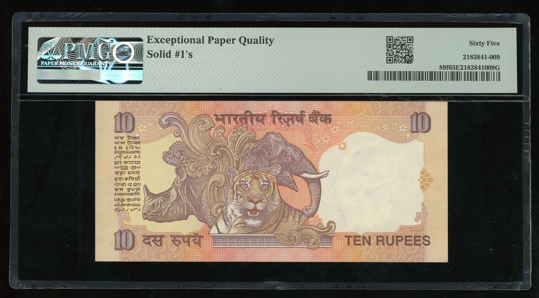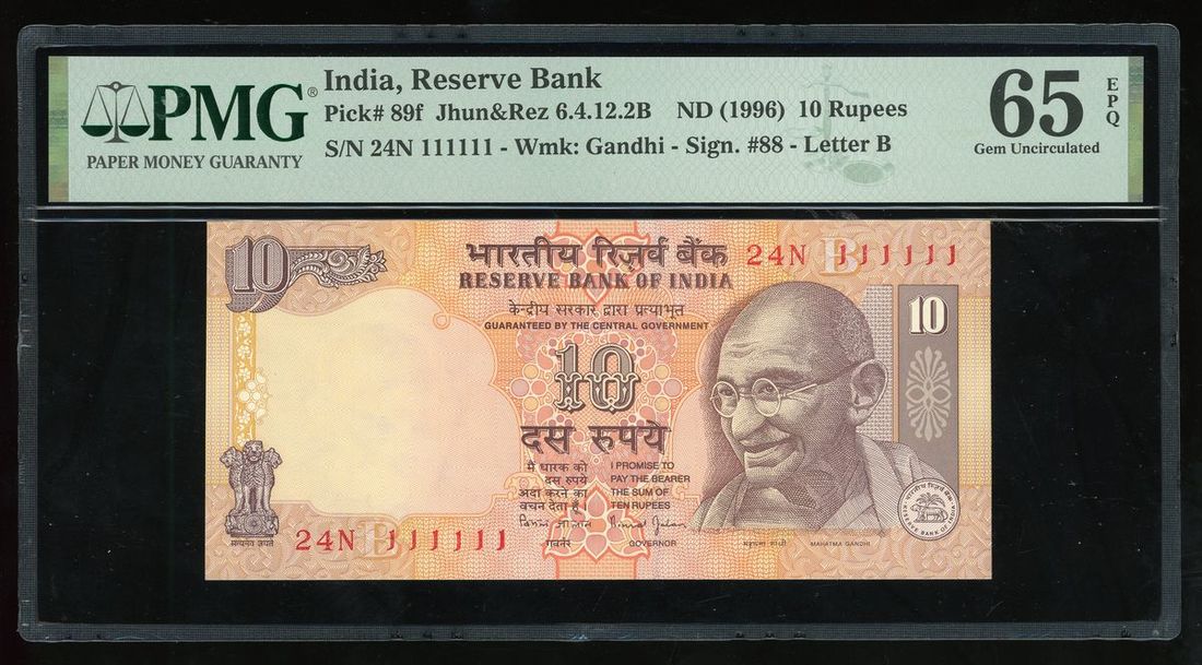 Reserve Bank of India, 10 rupees, ND (1996), solid serial number 24N 111111, (Pick 89f), PMG 65EPQ Gem Uncirculated. solid 1s