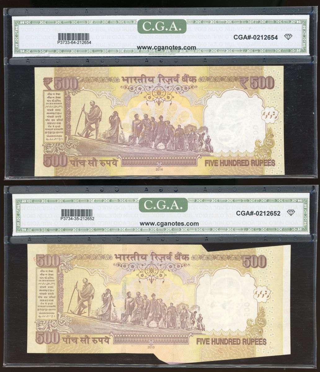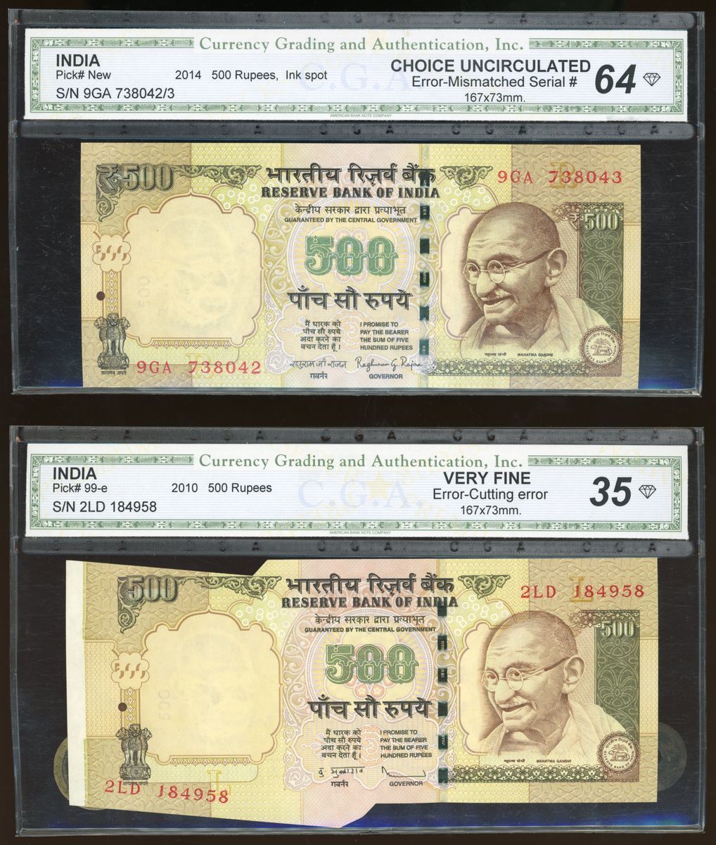 2010-14年印度1000盧比錯體兩枚, 包括編號不符及剪裁錯體, CGA 64, 35
