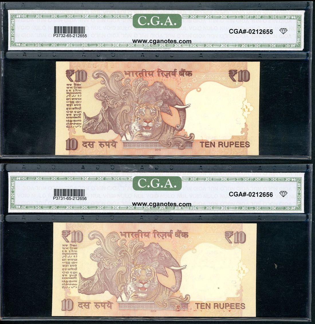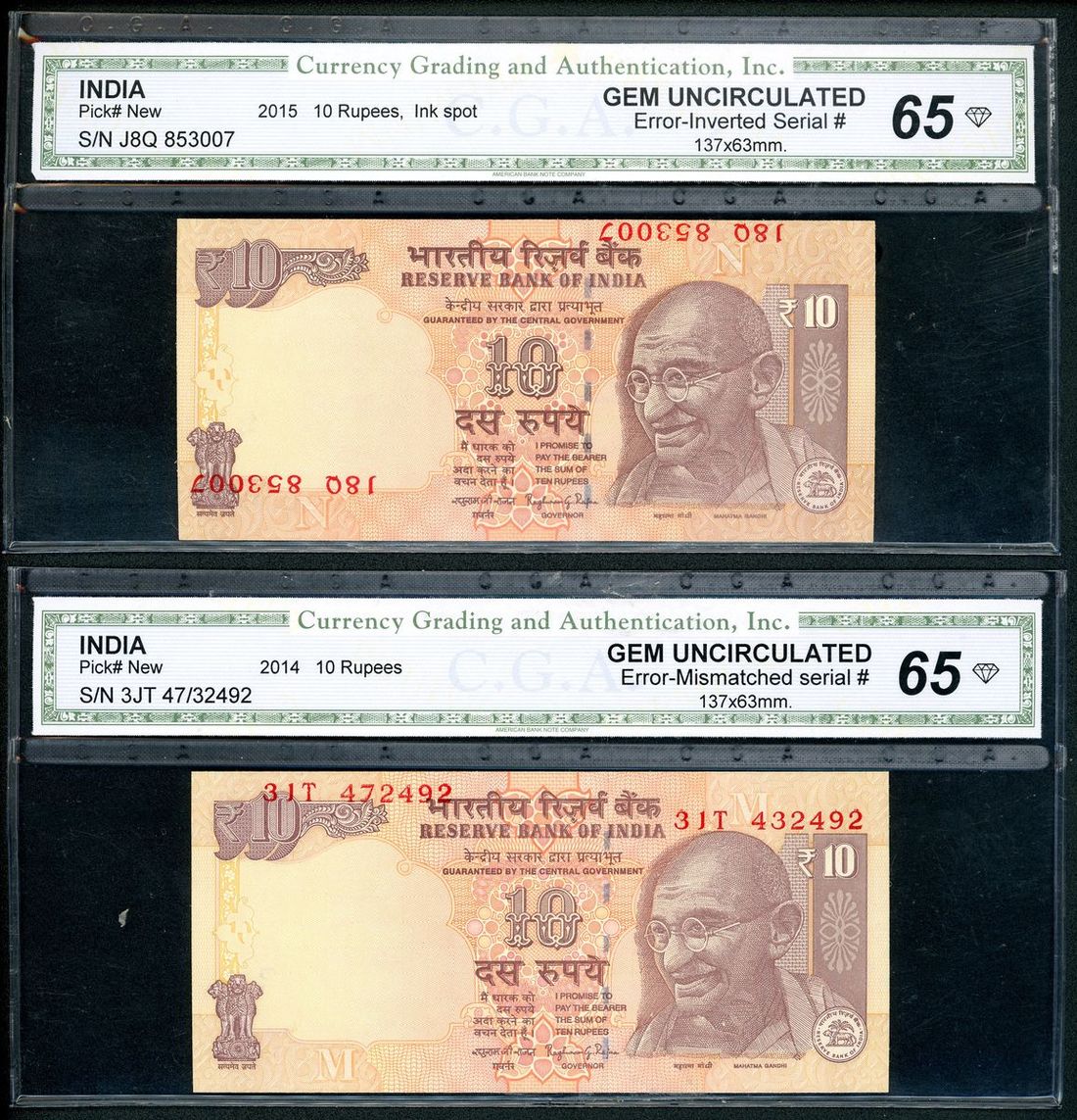 Reserve Bank of India, a pair of ERROR 10 rupees, 2014-15, serial numbers 31T 472492, J8Q 853007, both CGA 65 (2)