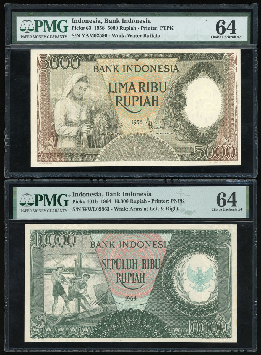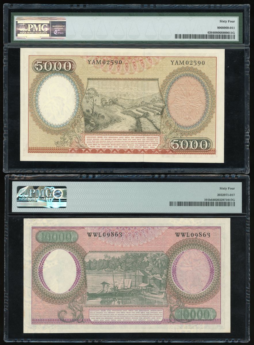 印尼一組兩枚, 包括 1958年5000及1964年10,000盾, 編號 YAM02590 and WWL09863, 均PMG 64