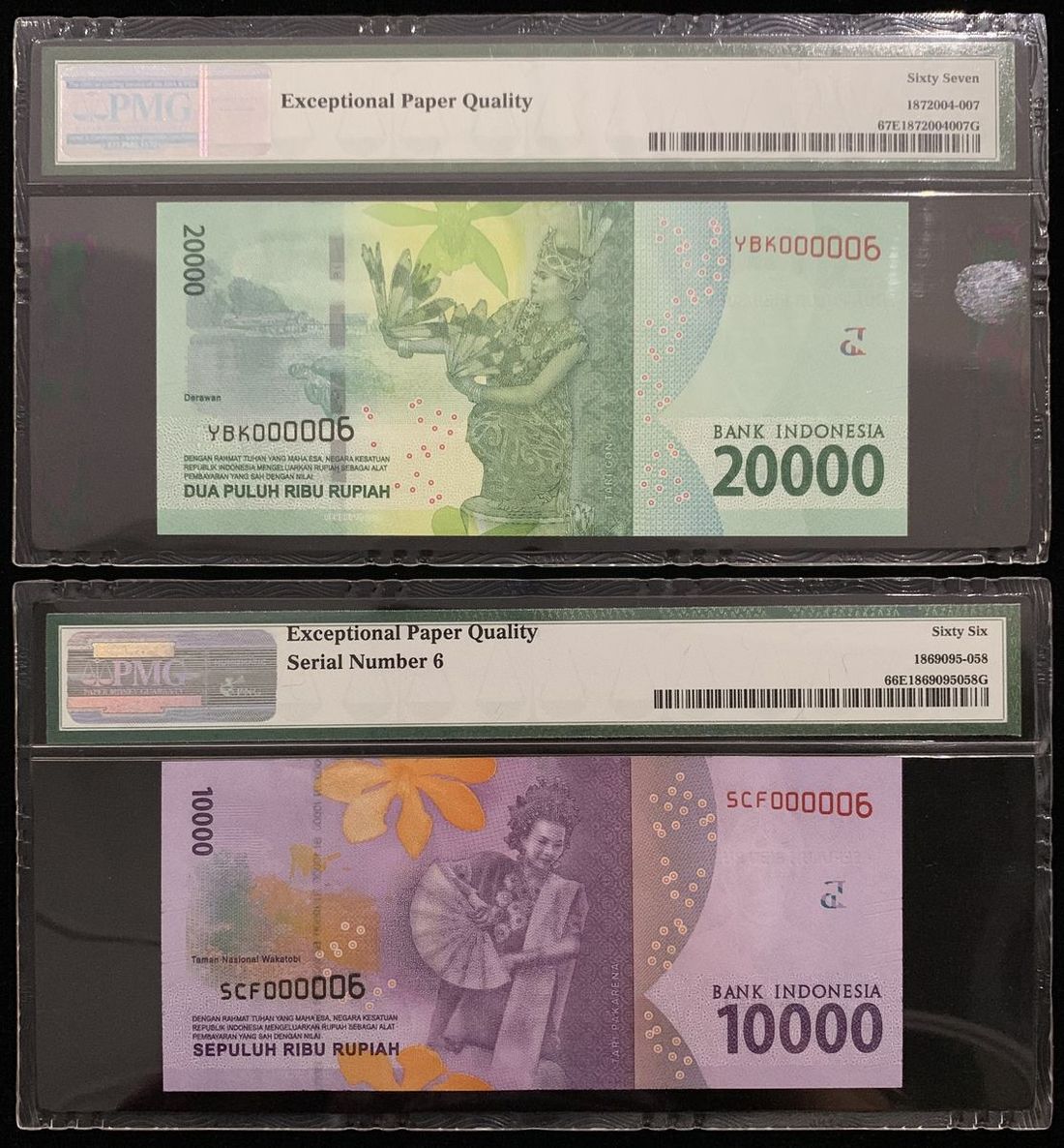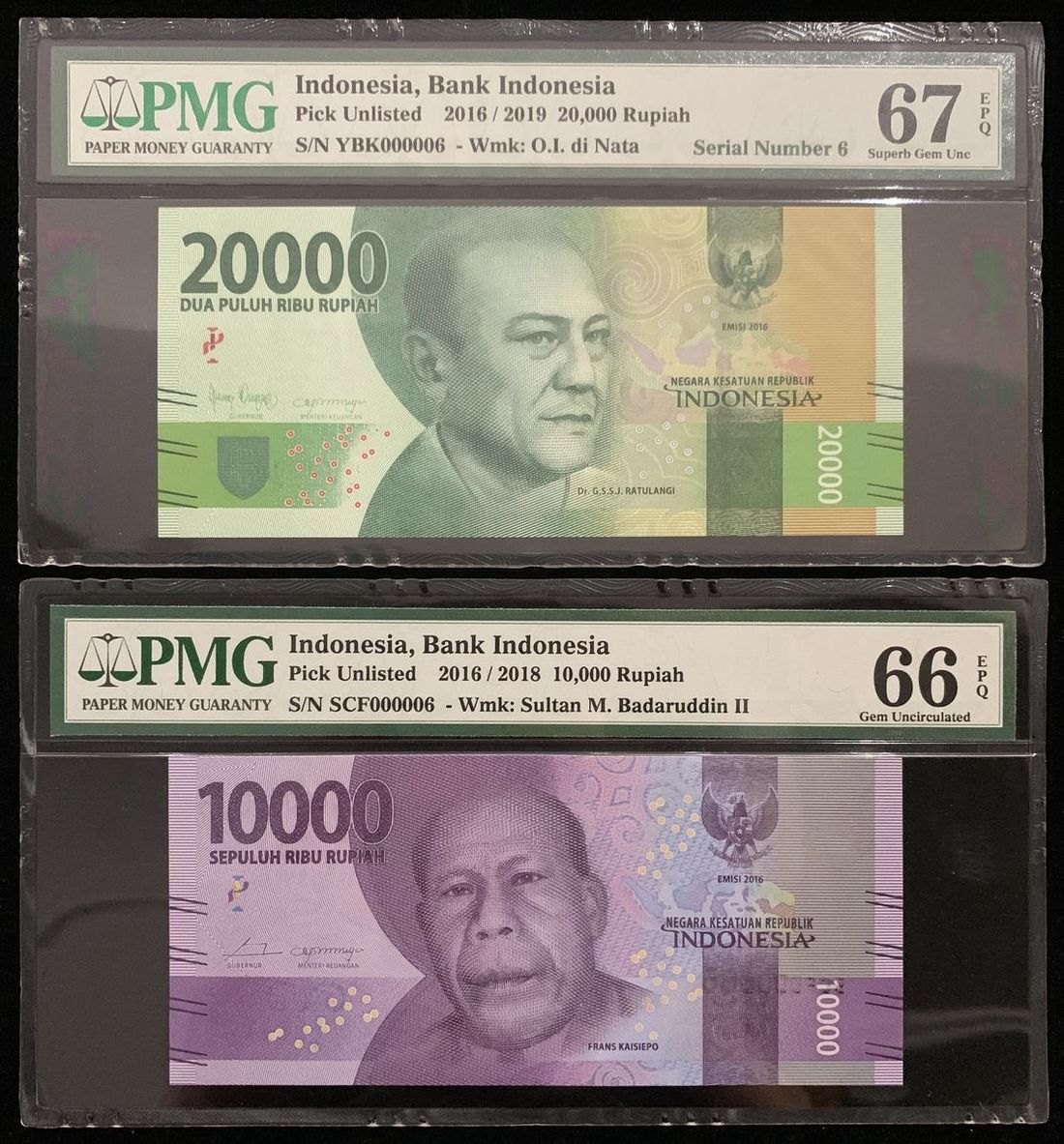 Indonesia, a pair of 10000 and 20000 rupiah, 2016/2018 and 2019, serial number SCF000006 and YBK000006, (Pick Unlisted), PMG 66EPQ and 67EPQ respectively.(2)