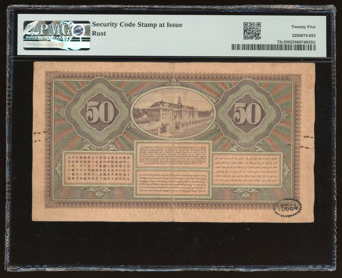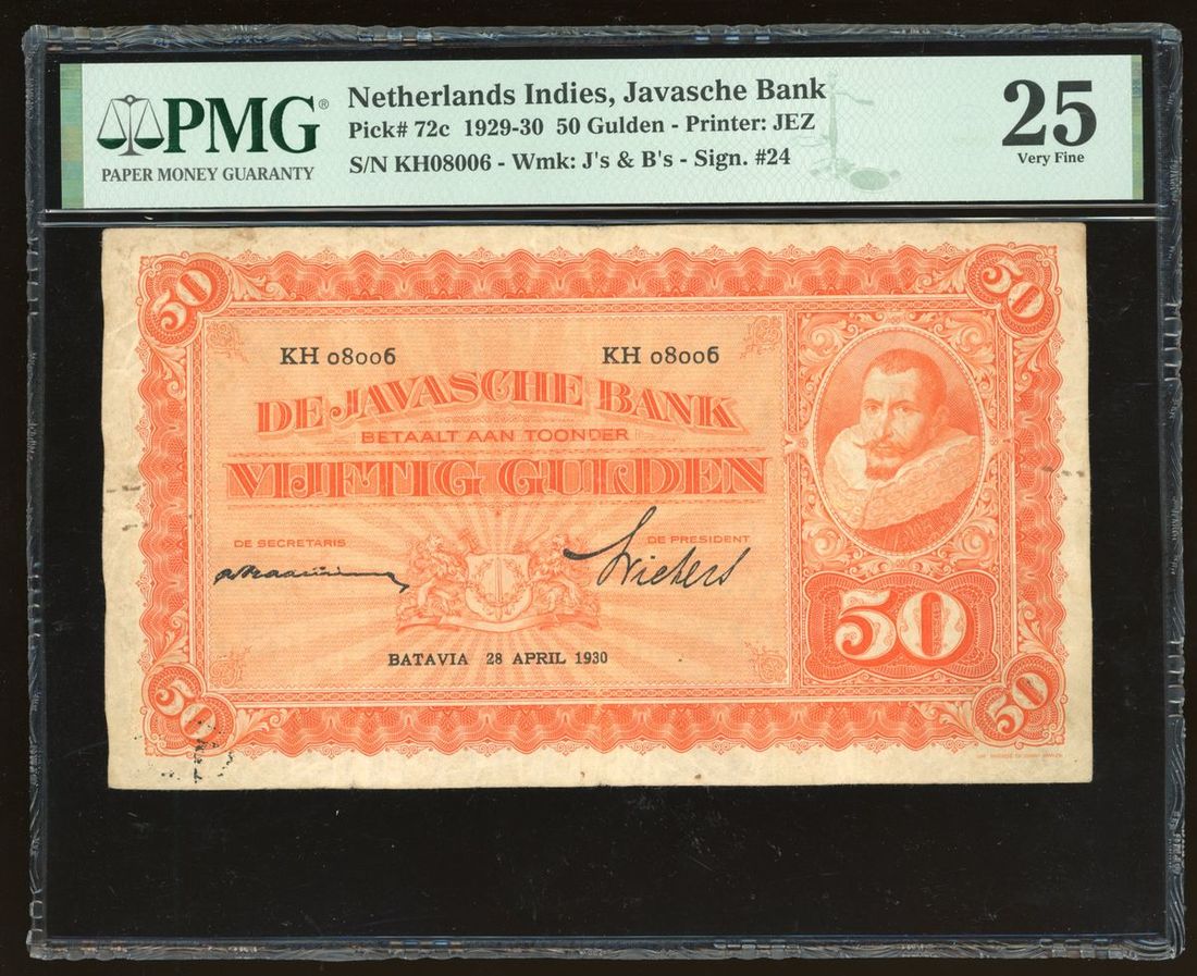 De Javasche Bank, Netherlands Indies, 50 gulden, 28.4.1930, serial number KH08006, (Pick 72c), PMG 25, security code stamp at issue, rust