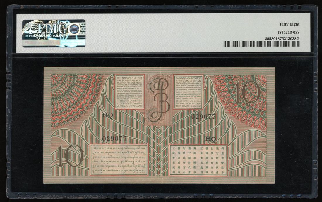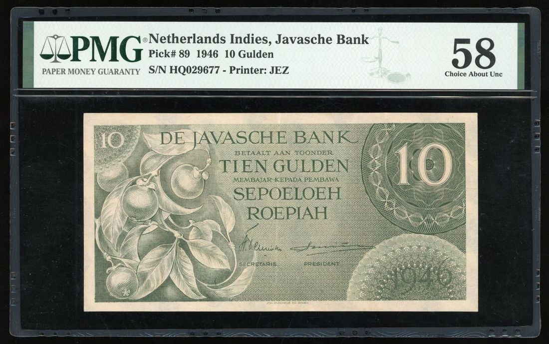De Javasche Bank, Netherlands Indies, 10 gulden, 1946, serial number HQ029677, (Pick 89), PMG 58 Choice About Uncirculated.