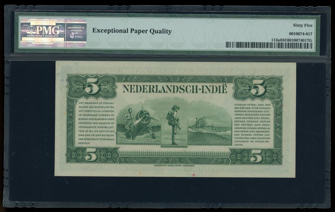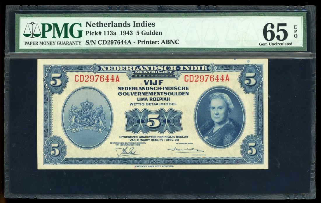 De Javasche Bank, Netherlands Indies, 5 gulden, 1943, serial number CD297644A, (Pick 113a), PMG 65EPQ.