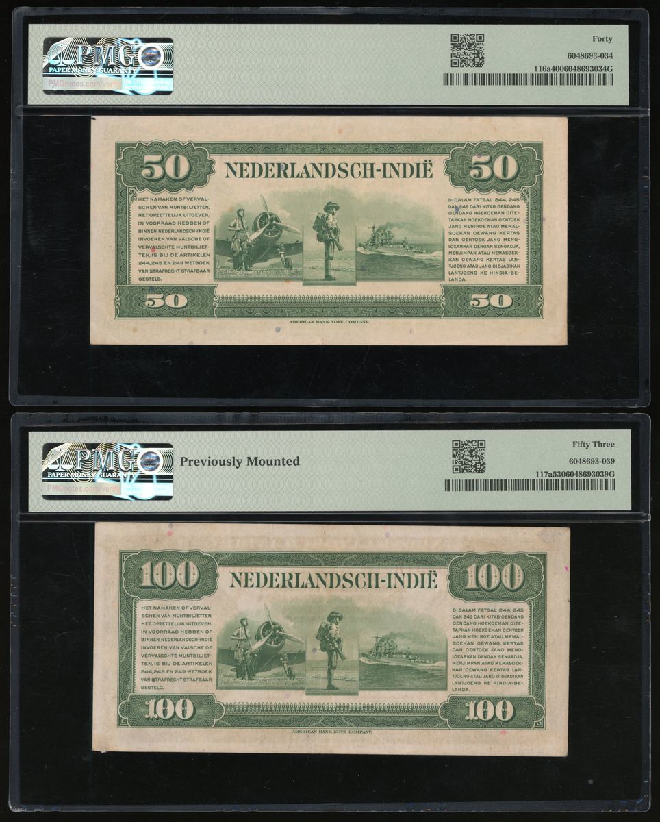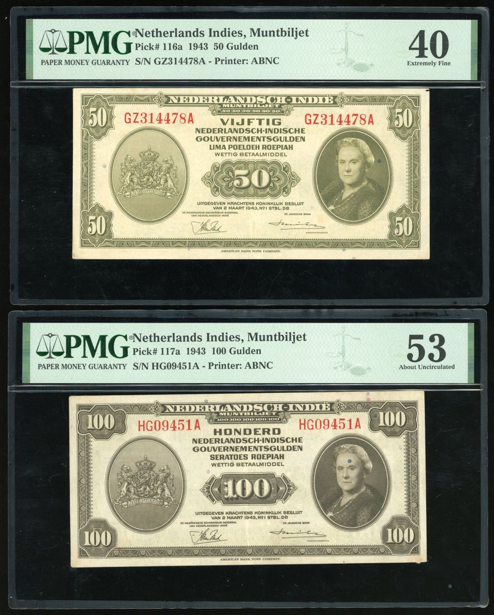 De Javasche Bank, Netherlands Indies Muntbiljet, A group of 2x including, 50 Guiden, 100 Gulden, 1943 (2), serial number GZ314478A, HG09451A, (Pick 116a, 117a), PMG 40 Extremely Fine, 53 About Uncirculated