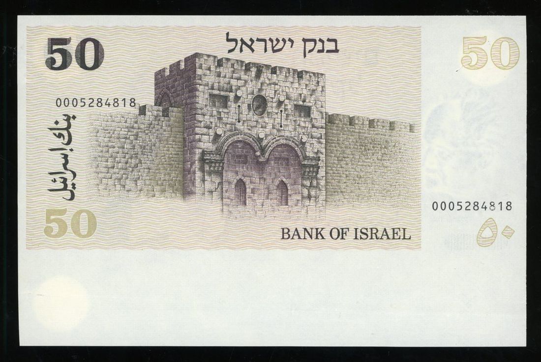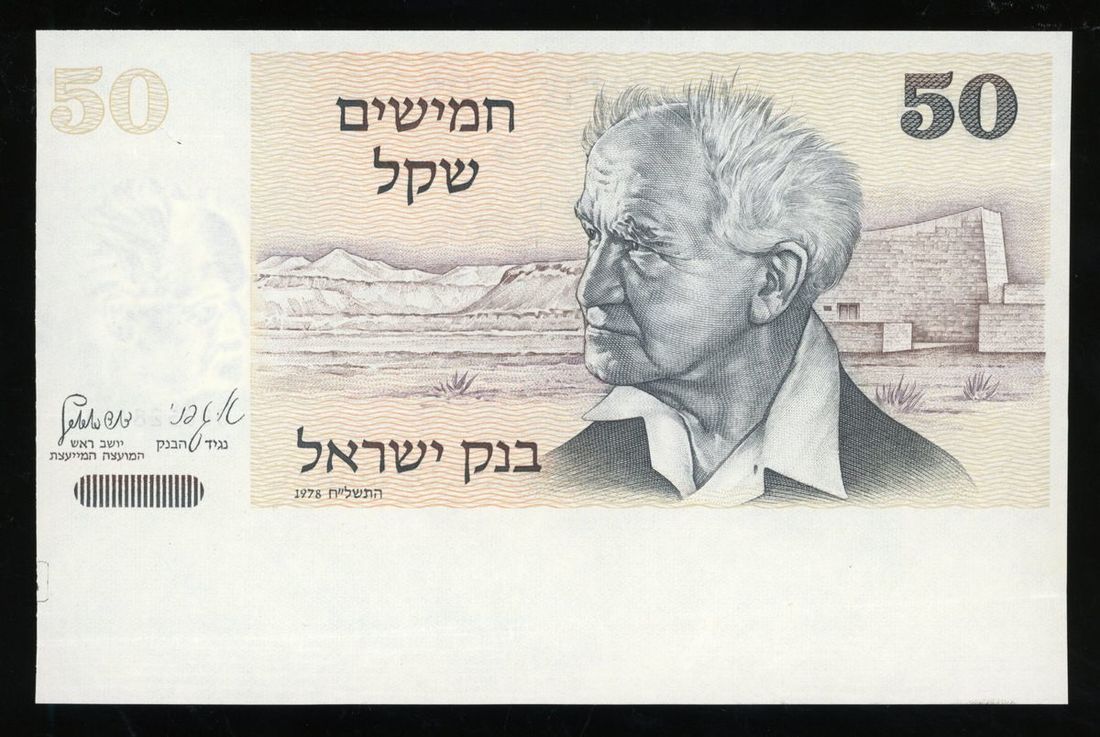 Bank of Israel, ERROR 50 sheqalim, 1978, serial number 0005284818, miscut error, selvedge at bottom, (Pick 46), about uncirculated, fold at bottom, viewing recommended, sold as seen, no return.
