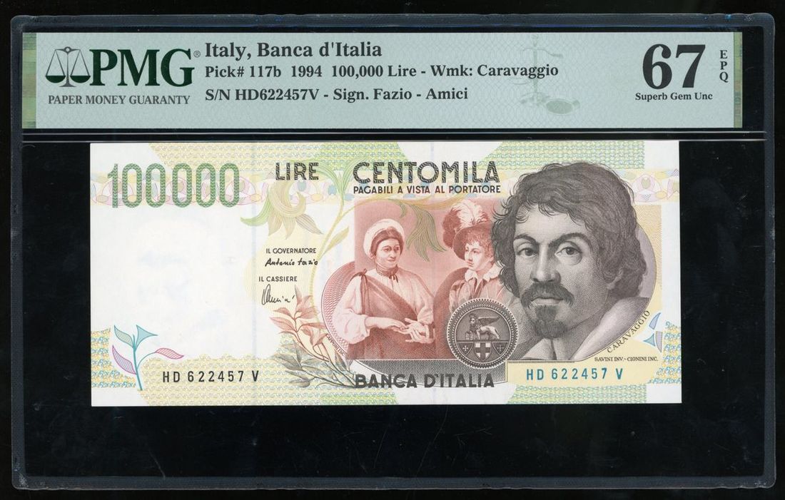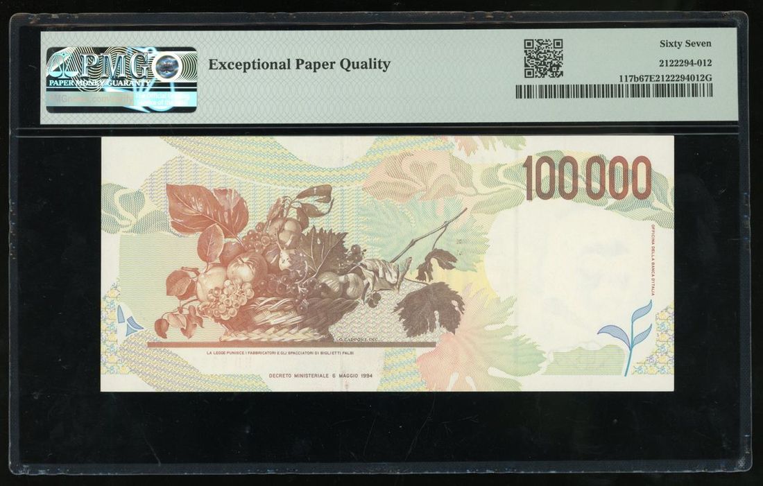 Banca d'Italia, 100,000 lire, 1994, serial number HD622457V, (Pick 117b), PMG 67EPQ