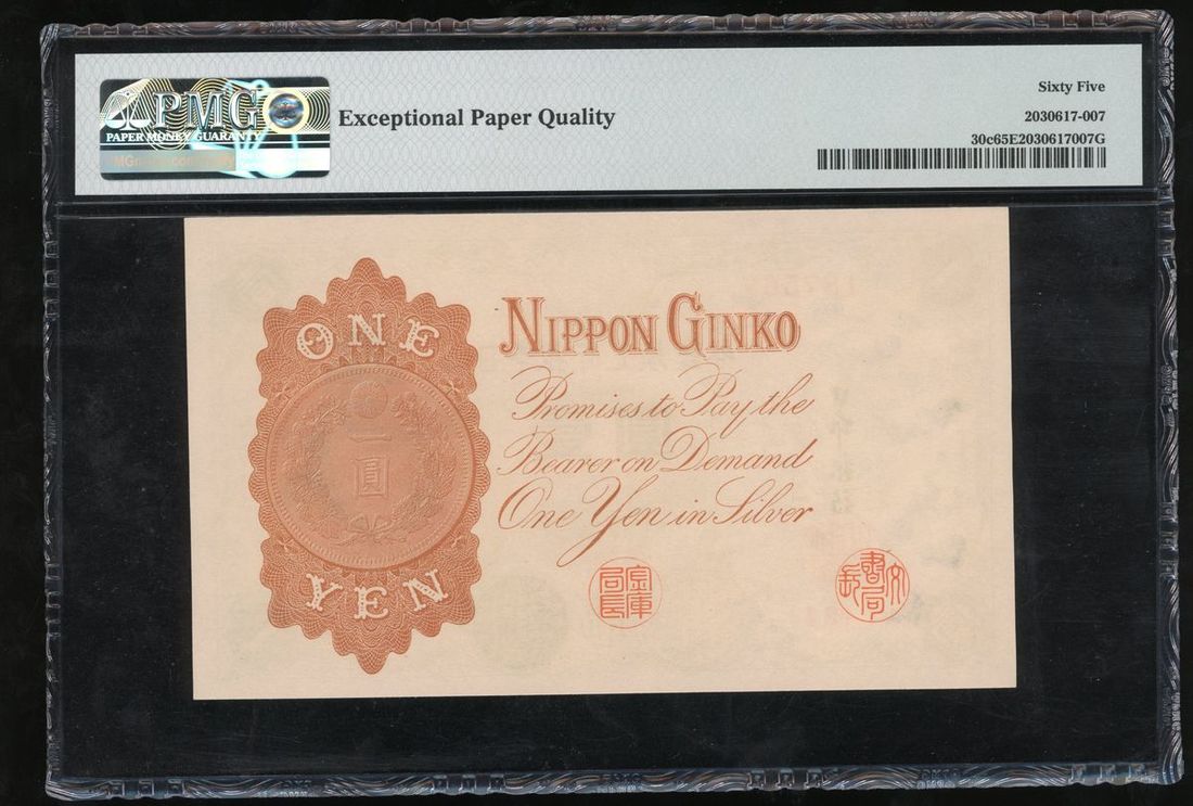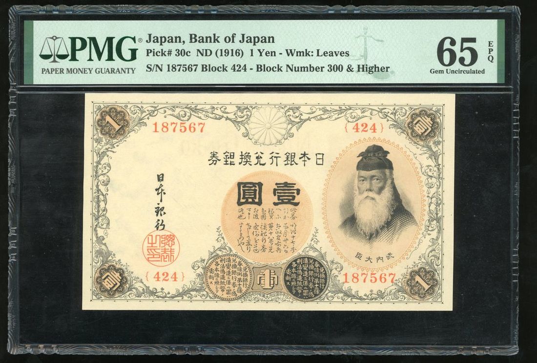 (x) Bank of Japan, 1 yen, ND (1916), serial number 187567, block 424, (Pick 30c), PMG 65EPQ