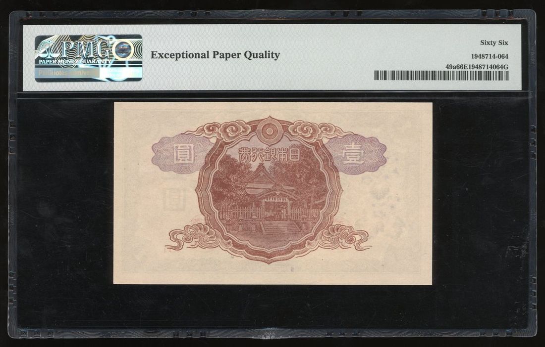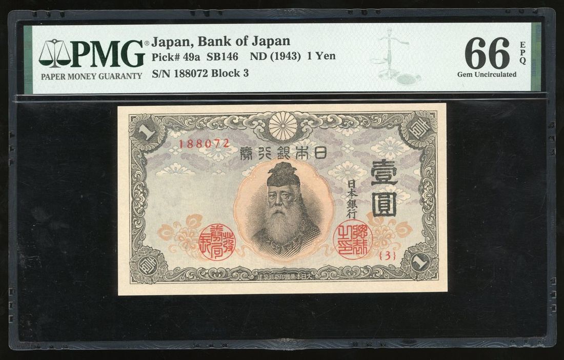 Bank of Japan, 1 yen, no date (1943), serial number 188072, block {3}, (Pick 49a), PMG 66EPQ Gem Uncirculated.