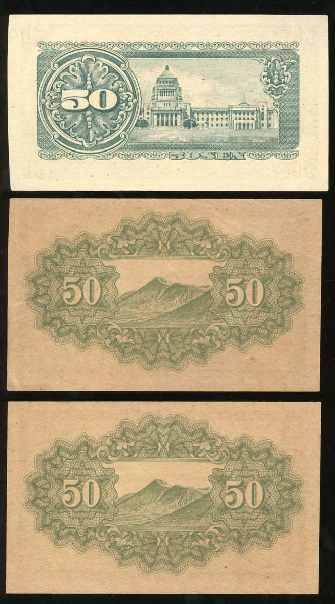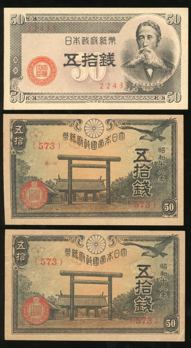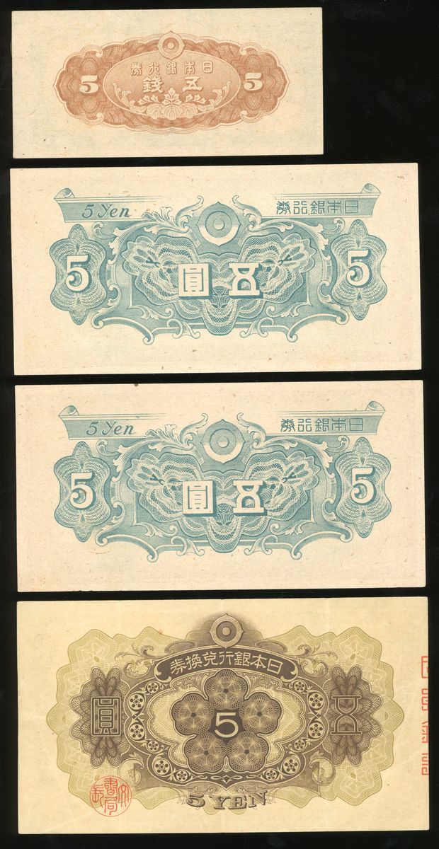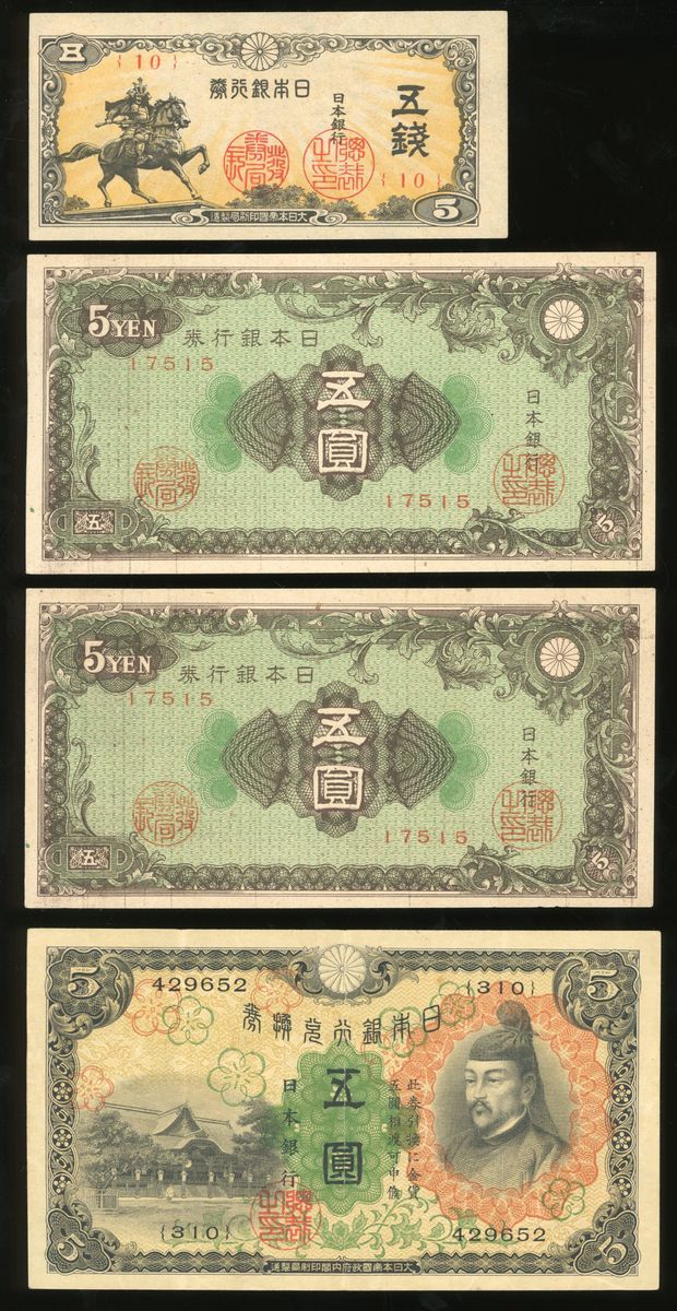 Japan, a group of 7, including: Nippon Ginko Ken 5 sen, ND (1944); Nippon Ginko Ken 5 yen (2), ND (1946); Nippon Ginko Da Kan Gin Ken 5 yen, ND (1930); Nippon Seifu Shihei 50 sen, ND (1948); Dai Nippon Teikoku Seifu Shihei 50 sen (2), 18th year of Showa (1943);