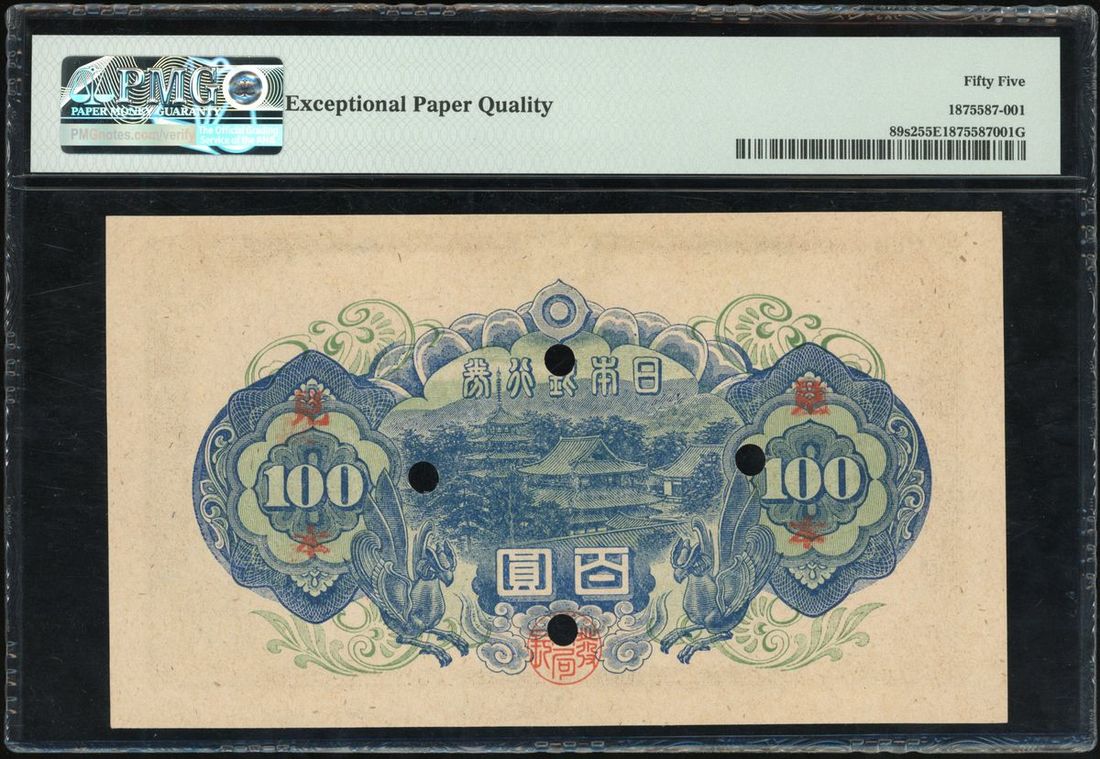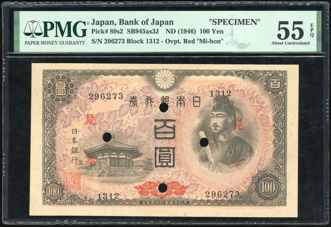 Bank of Japan, specimen 100 yen, ND (1946), serial number 296273 block 1312, overprint red "Min-hon",