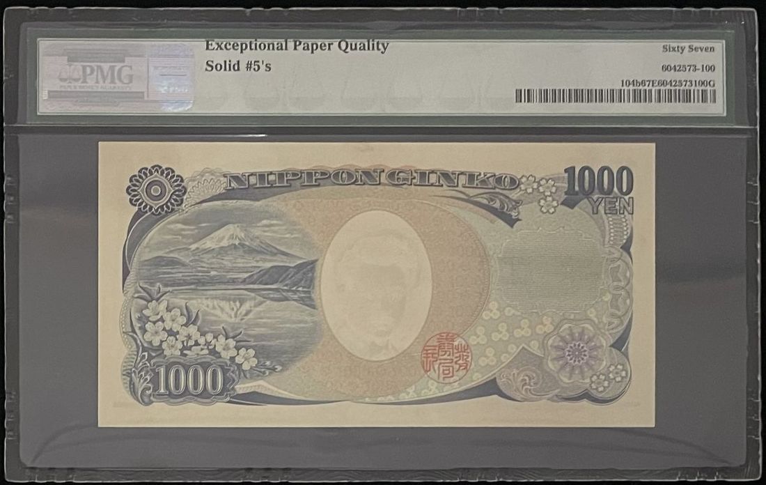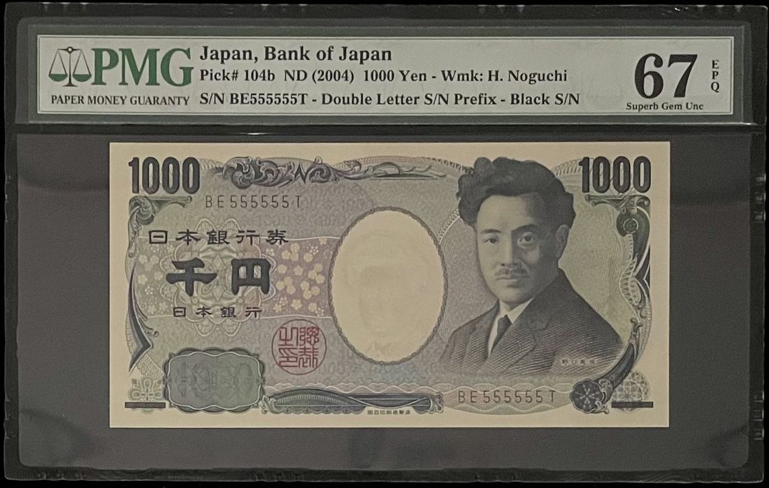 Bank of Japan, 1000 yen, ND (2004), black solid serial number BE555555T, (Pick 104b), PMG 67EPQ Superb Gem Uncirculated.