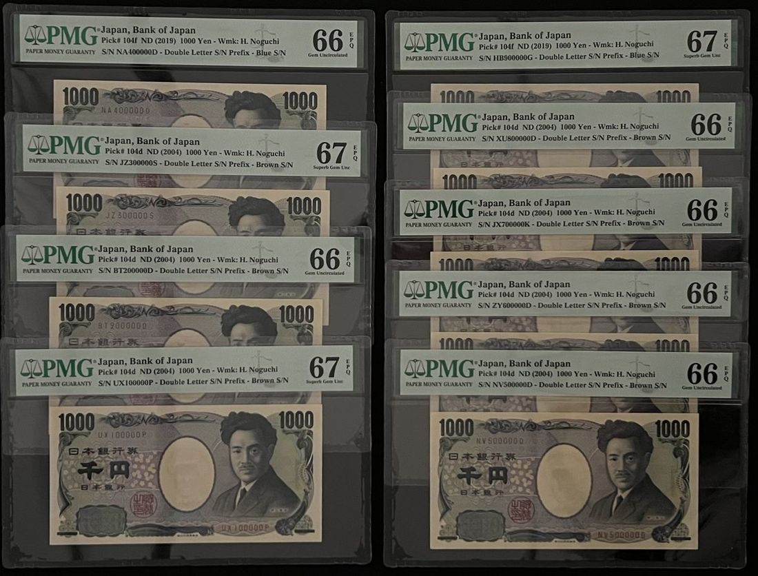 Bank of Japan, a group of 9x 1000 yen, no date (2004-2019), all with fancy serial numbers UX100000P, BT200000D, JZ300000S, NA400000D, NV500000D, ZY600000D, JX700000K, UX800000D and HB900000G, (Pick 104d and 104f), graded PMG 66EPQ-67EPQ (9).