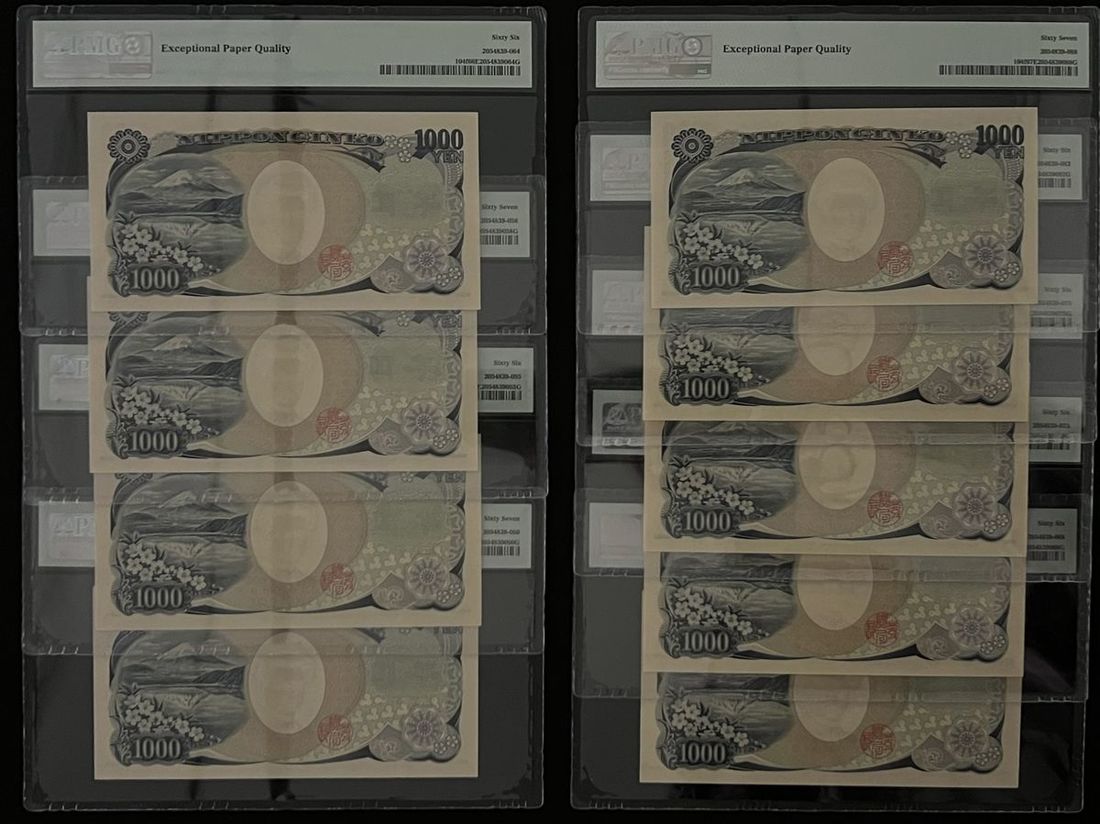 2004-19年日本1000圓一組9枚趣味號, 包括編號 UX100000P, BT200000D, JZ300000S, NA400000D, NV500000D, ZY600000D, JX700000K, UX800000D and HB900000G, PMG 66-67EPQ