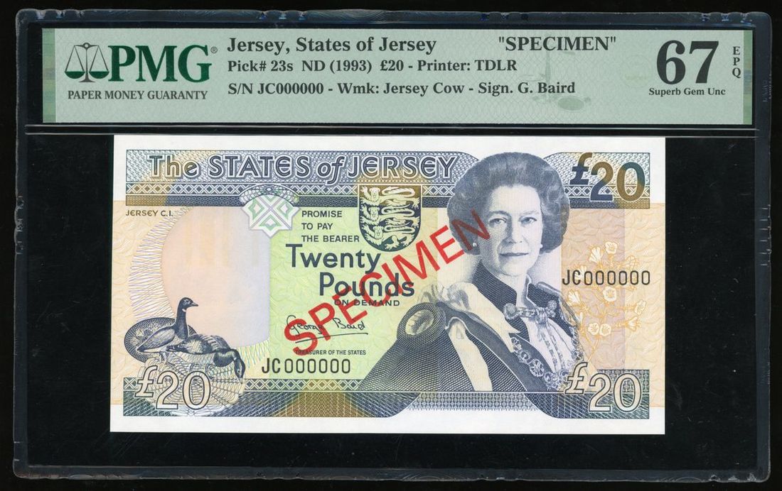 States of Jersey, specimen £20, ND (1993), serial number JC000000, (Pick 23s), PMG 67EPQ
