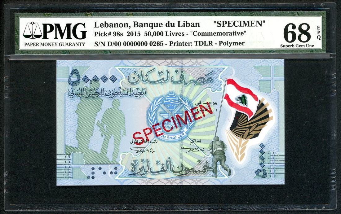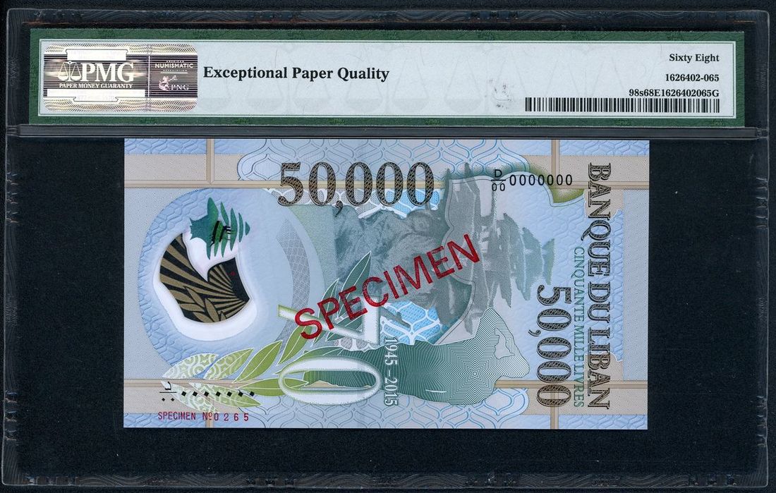Banque du Liban, Lebanon, specimen 50,000 livres, 2015 Commemorative, serial number D/00 000000, (Pick 98s), PMG 68EPQ