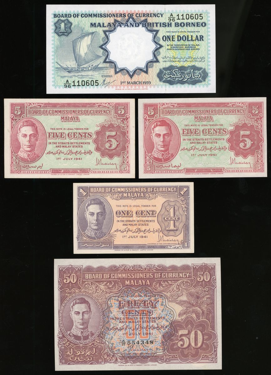 馬來亞一組五枚, 包括1941年1, 5 (2), 50仙, 及1959年馬來亞和英屬婆羅洲1元, aUNC-UNC品相
