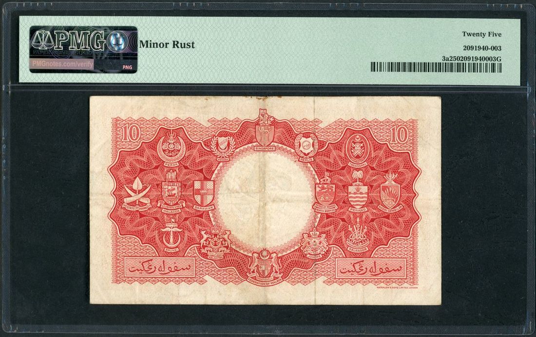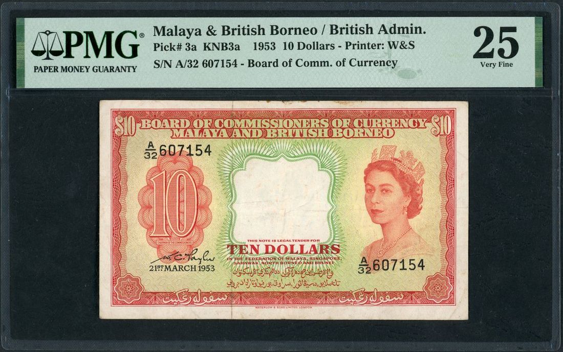 Board of Commissioners of Currency, Malaya & British Borneo, $10, 21.3.1953, serial number A/32 607154, orange on green and yellow underprint, Elizabeth II at right,