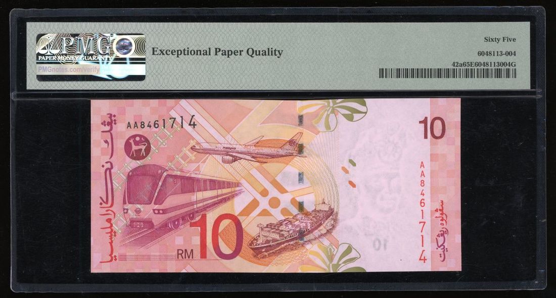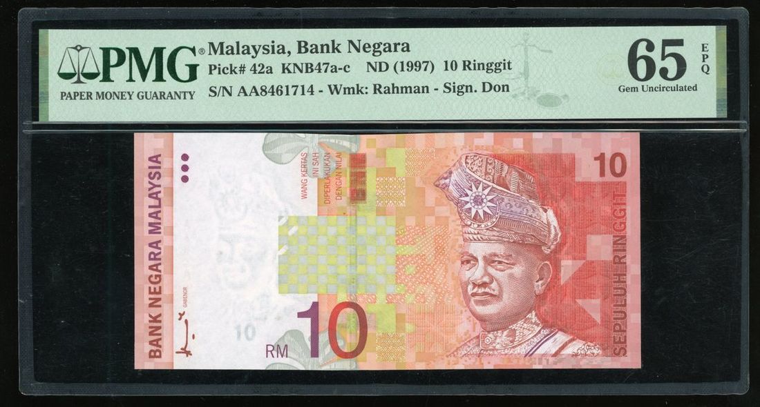 Bank Negara Malaysia, 10 ringgit, ND (1997), serial number AA8461714, (Pick 42a), PMG 65EPQ