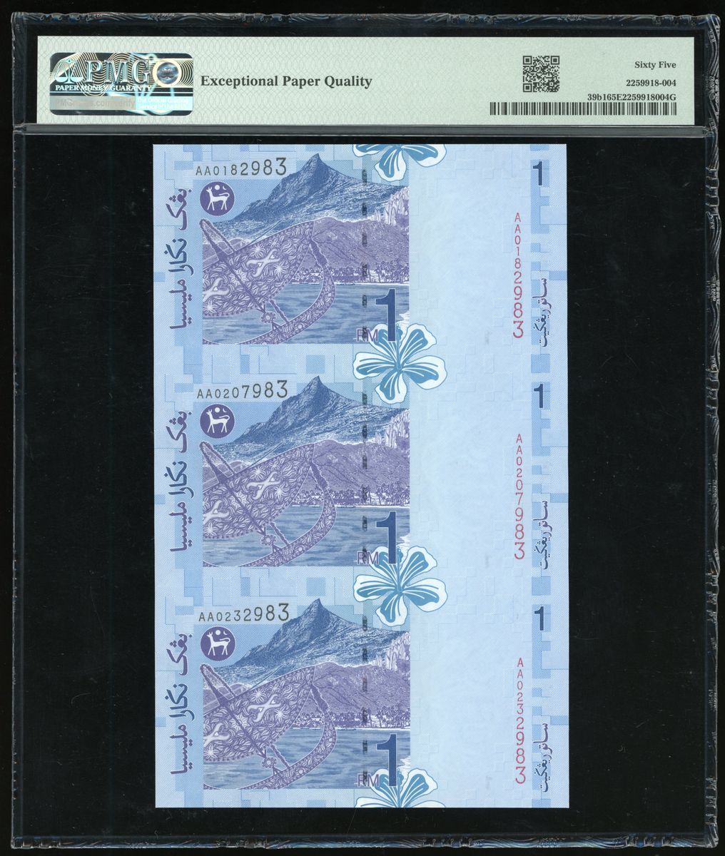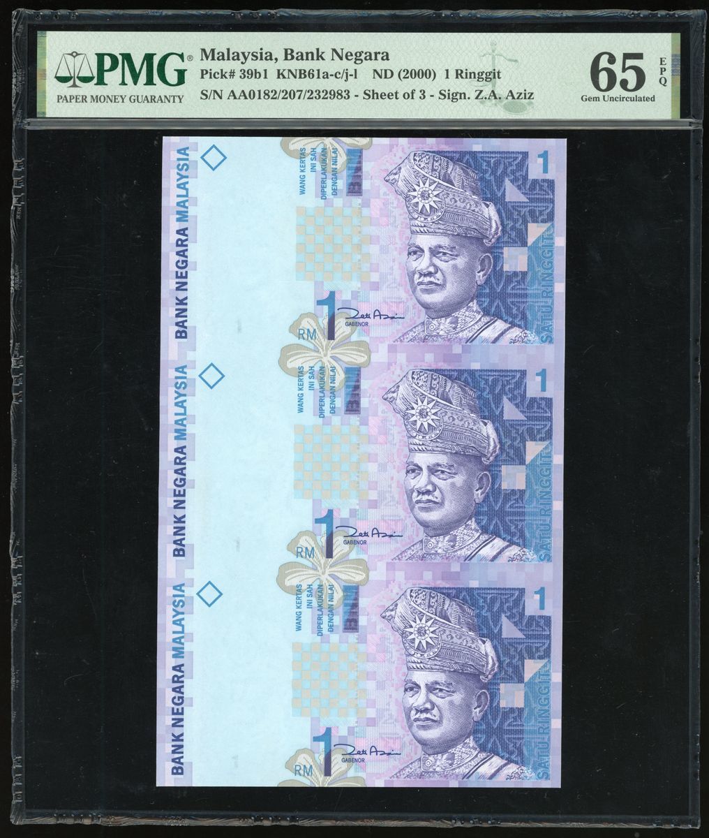 Malaysia, Bank Negara, an uncut sheet of 3x 1 ringgit, no date(2000), serial numbers AA0182/207/232983, (Pick 39b1), PMG 65EPQ Gem Uncirculated.