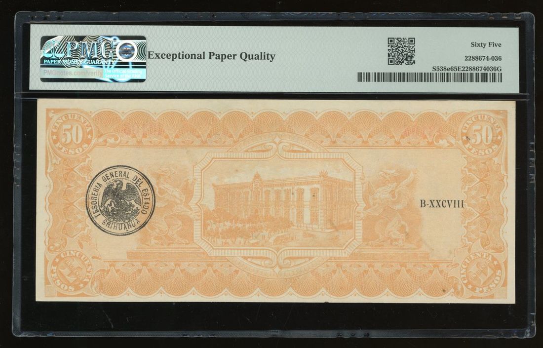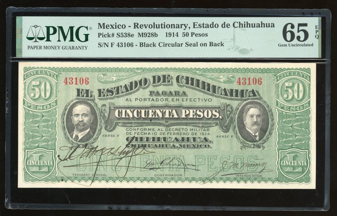 El Estado de Chihuahua, Mexico, 50 pesos, 1914, serial number F43106, (Pick S538e), PMG 65EPQ
