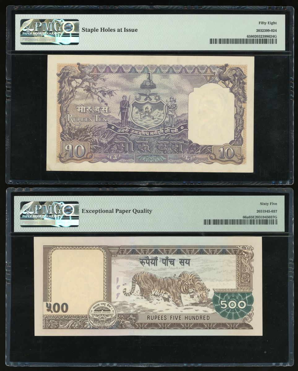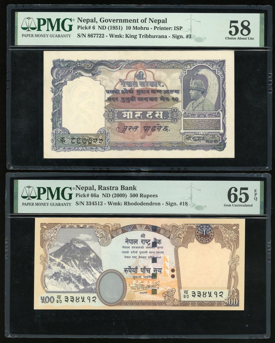 Nepal, a pair of notes, consists of Government of Nepal, 10 mohru, no date (1951) and Rastra Bank, 500 rupees, no date (2009), serial numbers 867722 and 334512, (Pick 6 and 66a), graded PMG 65EPQ and 58(Staple Hole as Issue) respectively (2)
