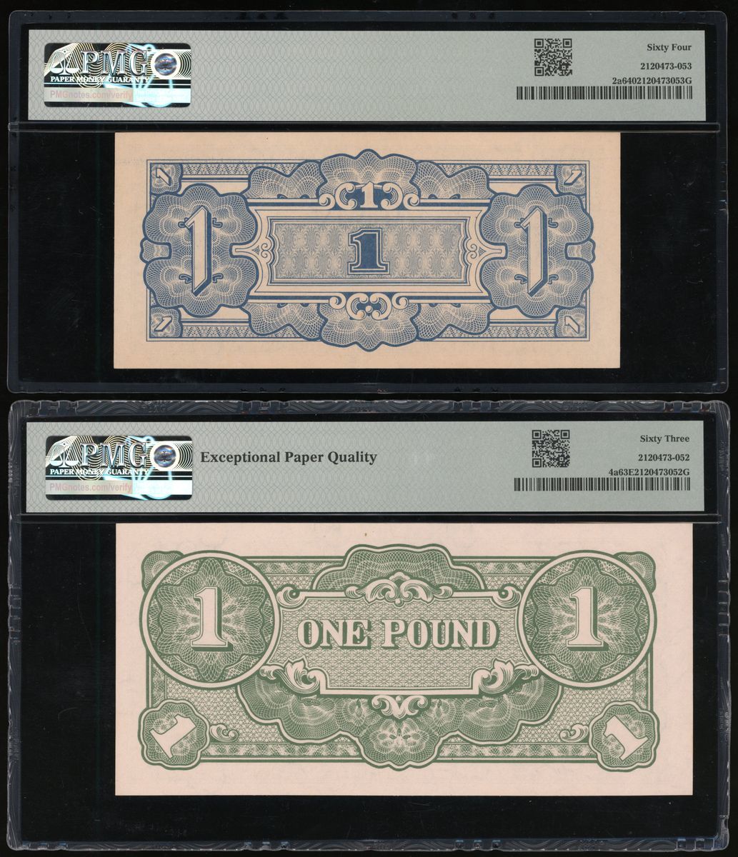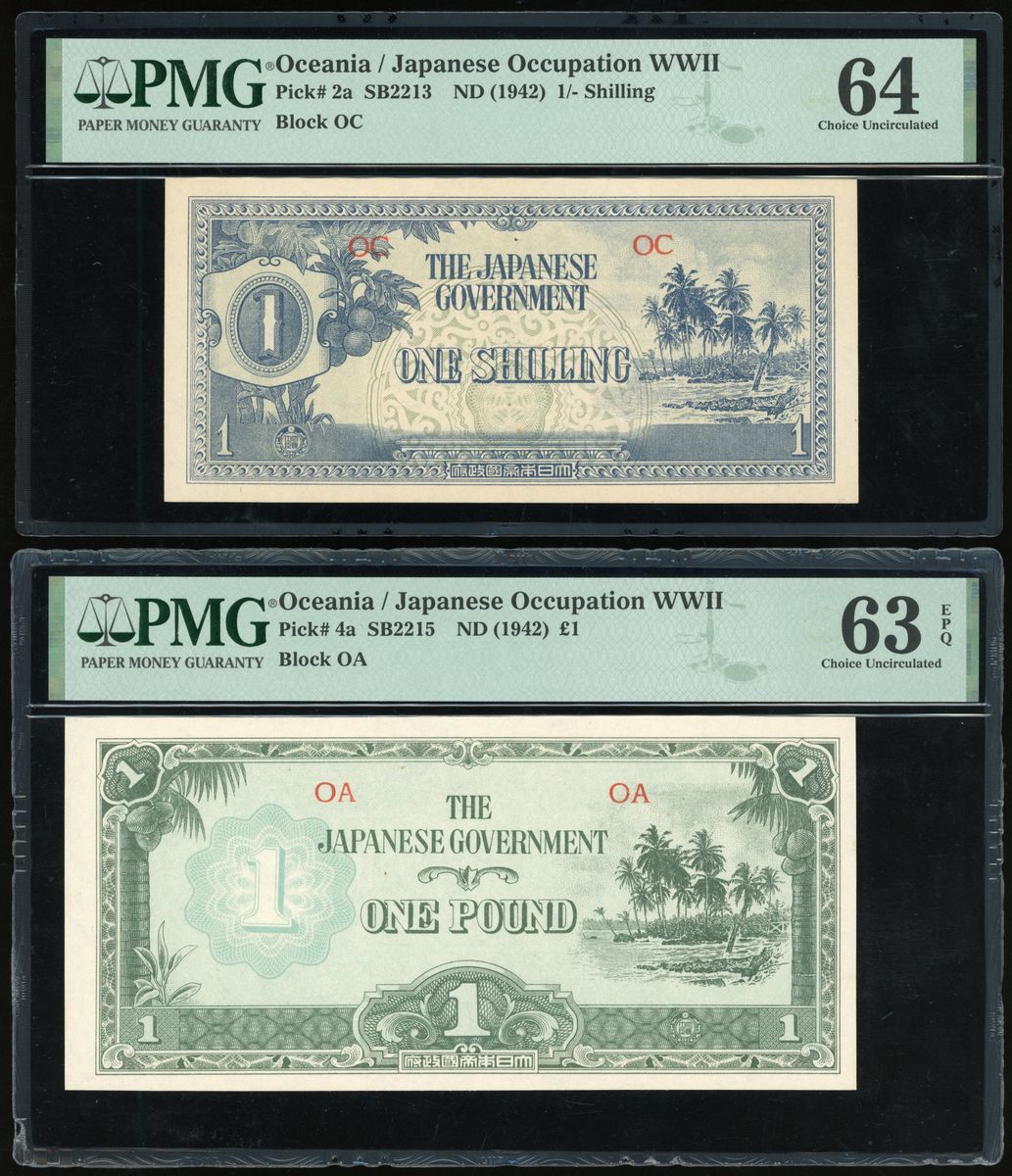 Oceania, Japanese Occupation WWII, a pair of 1 shilling and 1 pound, no date (1942), block OC and OA, (Pick 2a and 4a), graded PMG 64 and 63EPQ respectively (2).