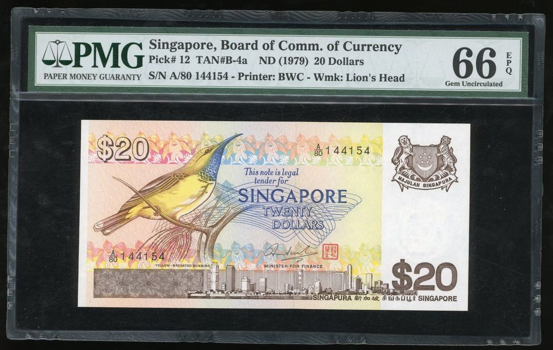 Board of Commissioners of Currency, Singapore, $20, ND (1979), "Bird" series, serial number A/80 144154, (Pick 12), PMG 66EPQ Gem Uncirculated.
