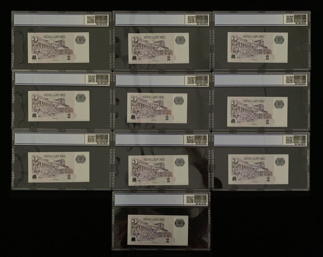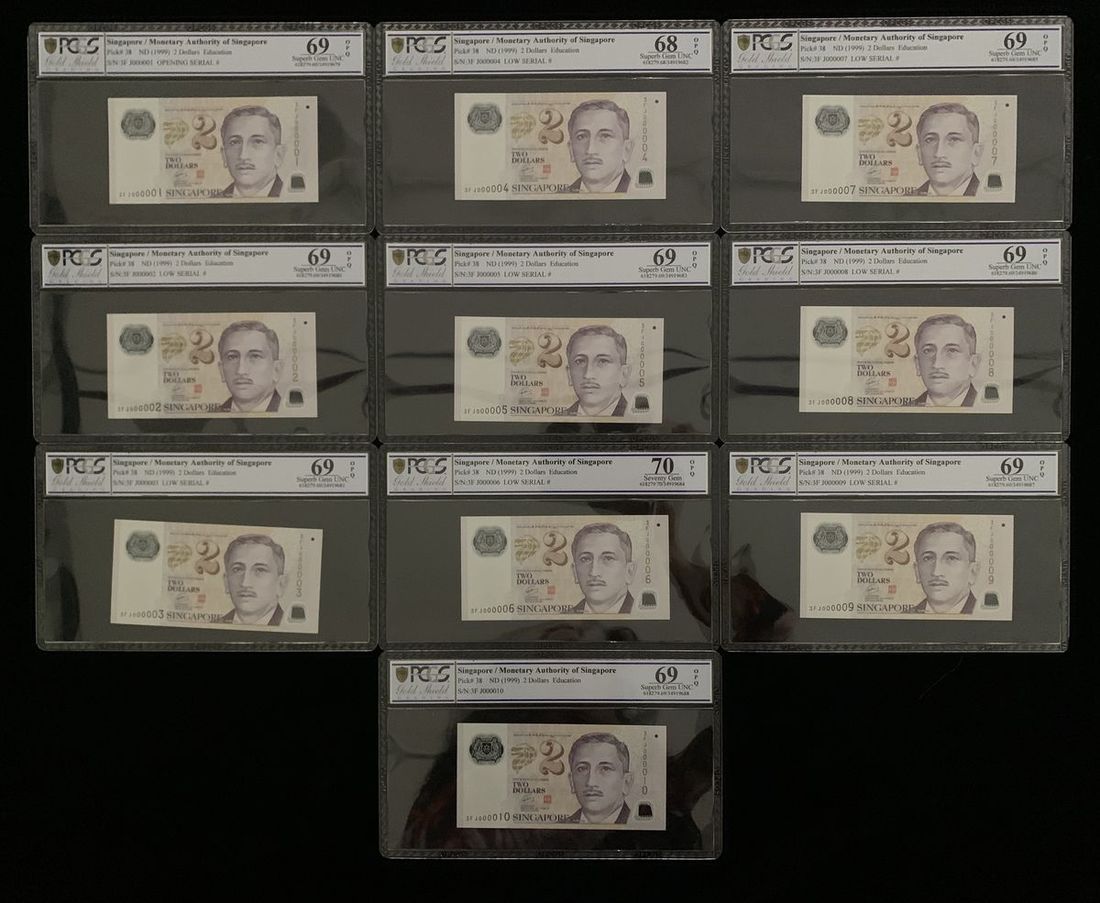 Monetary Authority of Singapore, a run of 10x consecutive $2 notes, ND (1999), opening serials 3F J00001-010, (Pick 38), all in PCGS holders, 8 of them including serial #1 graded 69OPQ, serial #4 graded 68OPQ, serial #6 graded 70OPQ (10)