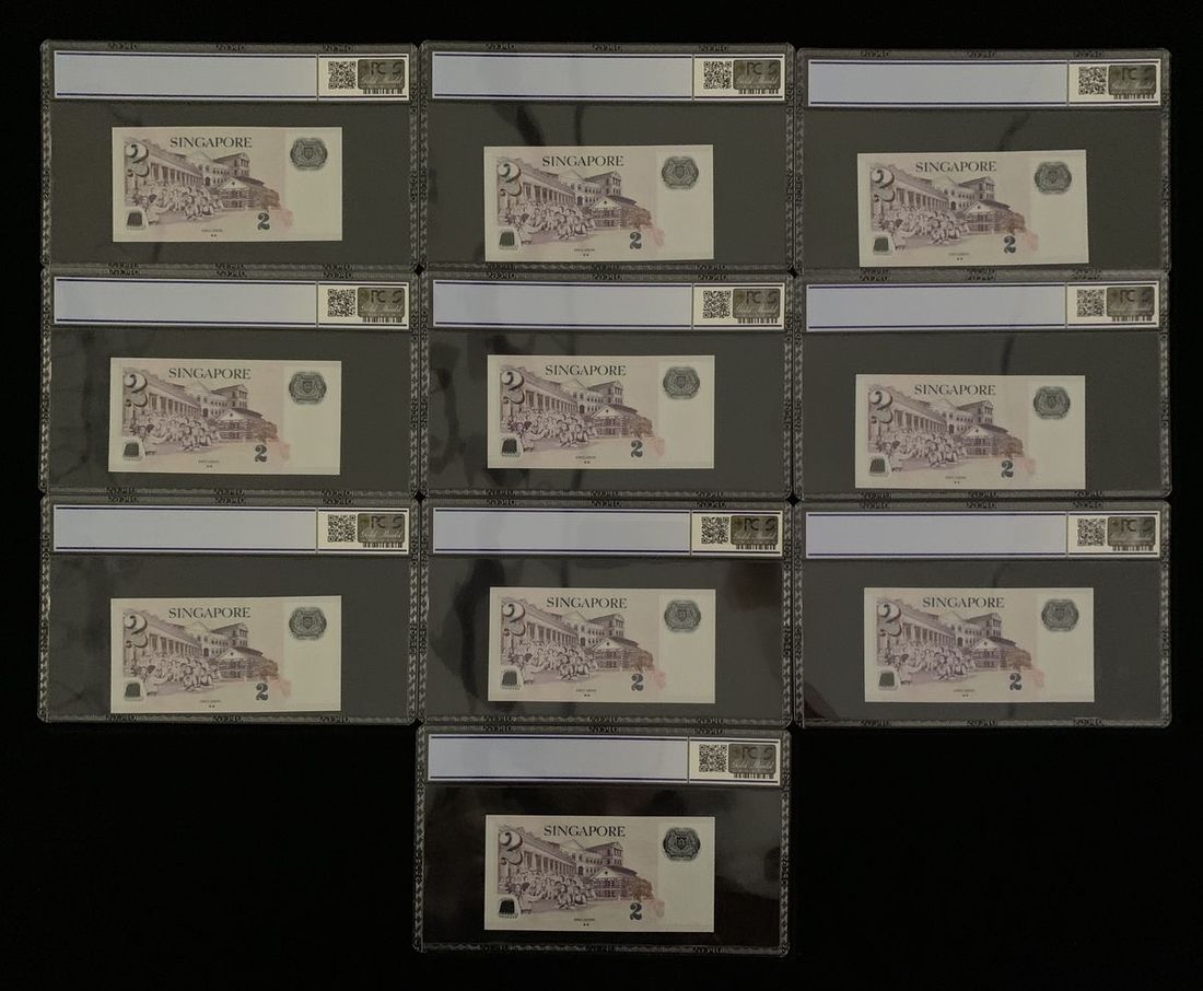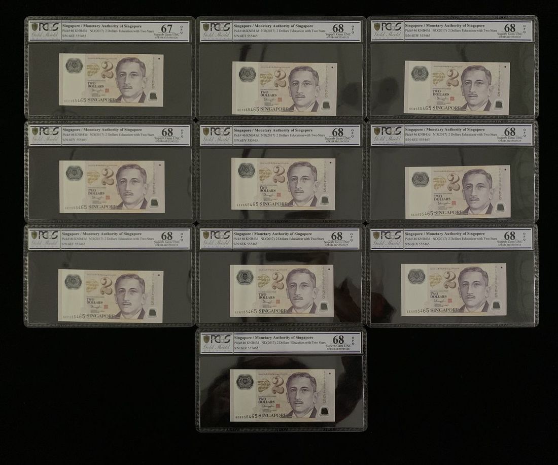 Monetary Authority of Singapore, a group of 10x $2 notes, ND (2017), identical prefix and serial number 6EE 555465, (Pick 46), all in PCGS holders, 9 of them graded 68OPQ and 1 graded 67OPQ (10)