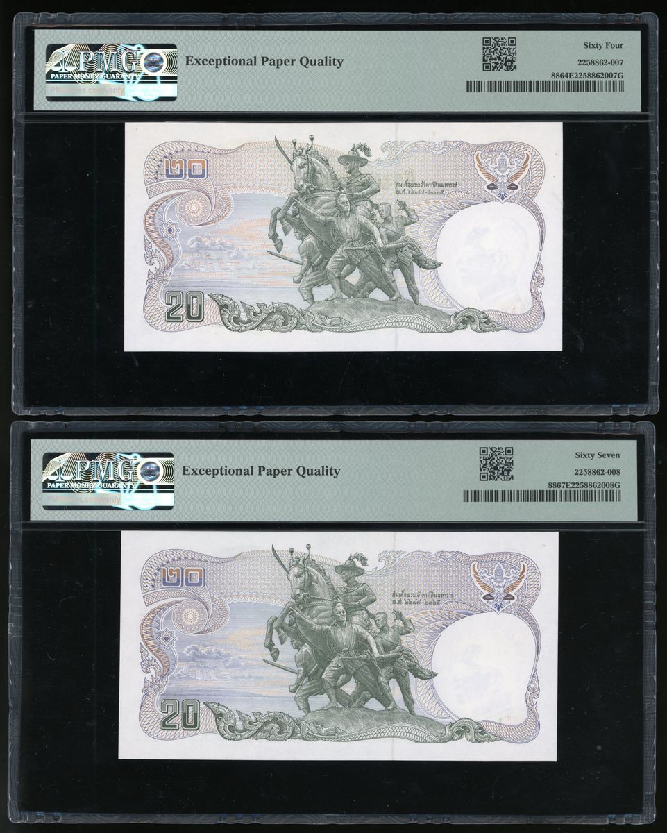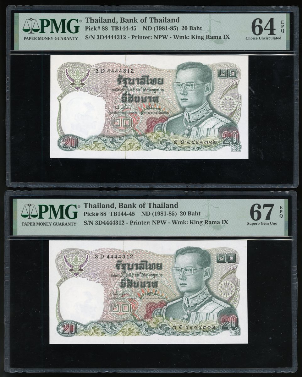 Bank of Thailand, a pair of 20 baht, ND (1981-1985), identical prefix and serial numbers 3D4444312, (Pick 88), graded PMG 67EPQ Superb Gem Uncirculated and 64EPQ Choice Uncirculated (2)