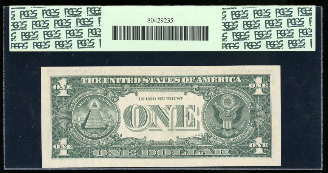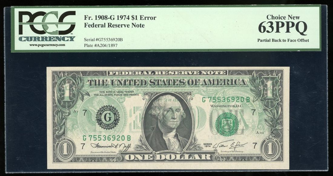 Federal Reserve Note, United States of America, ERROR $1, 1974, serial number G75536920B, (Friedberg 1908-G), PCGS 63PPQ Choice New, partial back to face offset ink error