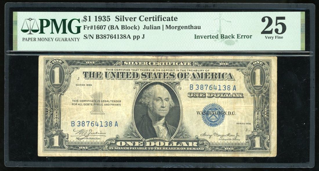 Silver Certificate, United States of America, ERROR $1, 1995, serial number B38764138A, (Friedberg 1607), PMG 25. Inverted reverse design error, interesting