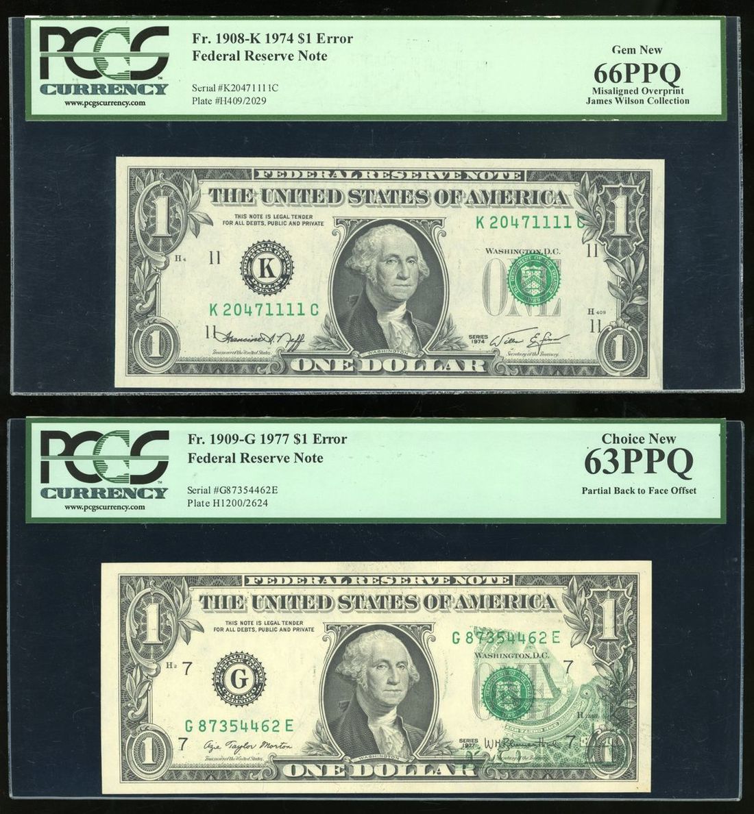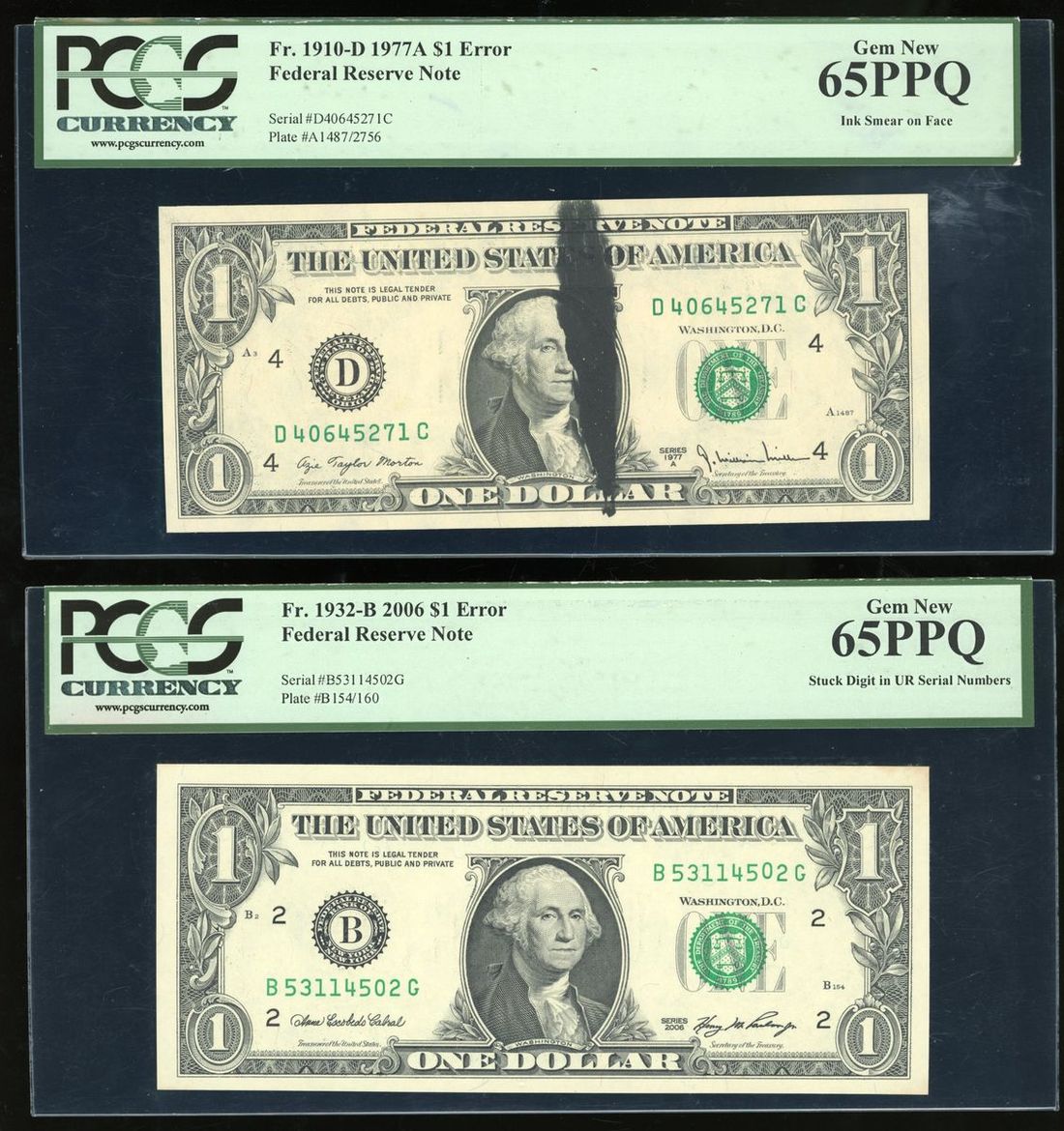 Federal Reserve Note, United States of America, a group of 4x ERROR $1, 1974, 1977, 2006, including misalignment, partial reverse to face design offset error, ink smear error and minor stuck digit error