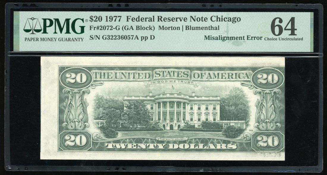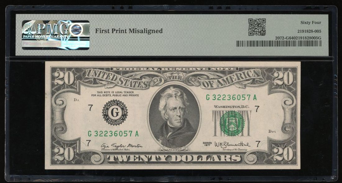 1977年美國20元錯體, 編號 G32236057A, 印刷移位錯體, PMG 65EPQ,
