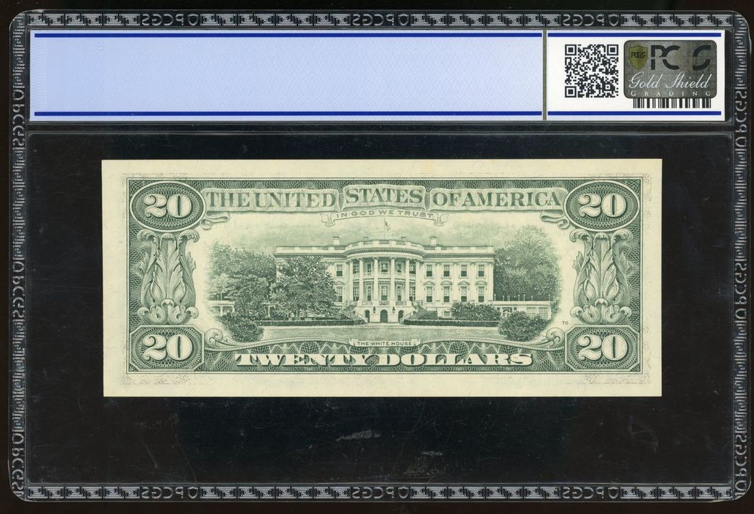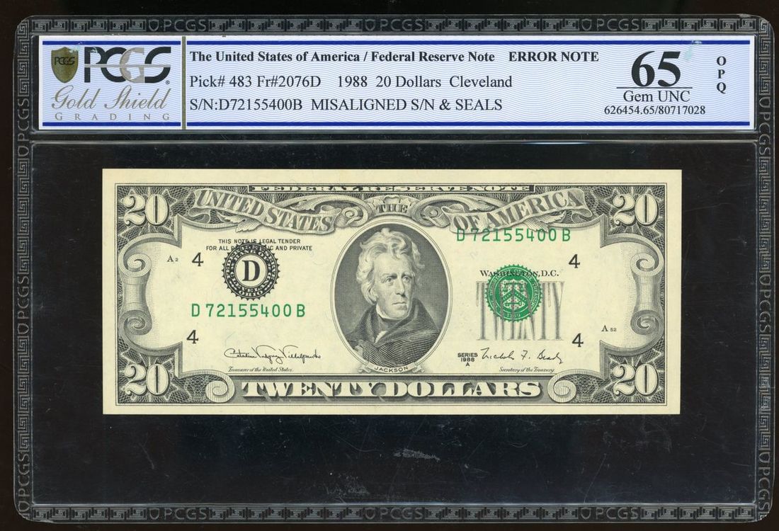 1988年美國20元錯體, 編號 D72155400B, 印刷移位錯體, PCGS 65OPQ