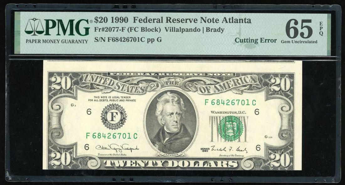 United States, $20, 1990, serial number F68426701C, Error Note, cutting error,