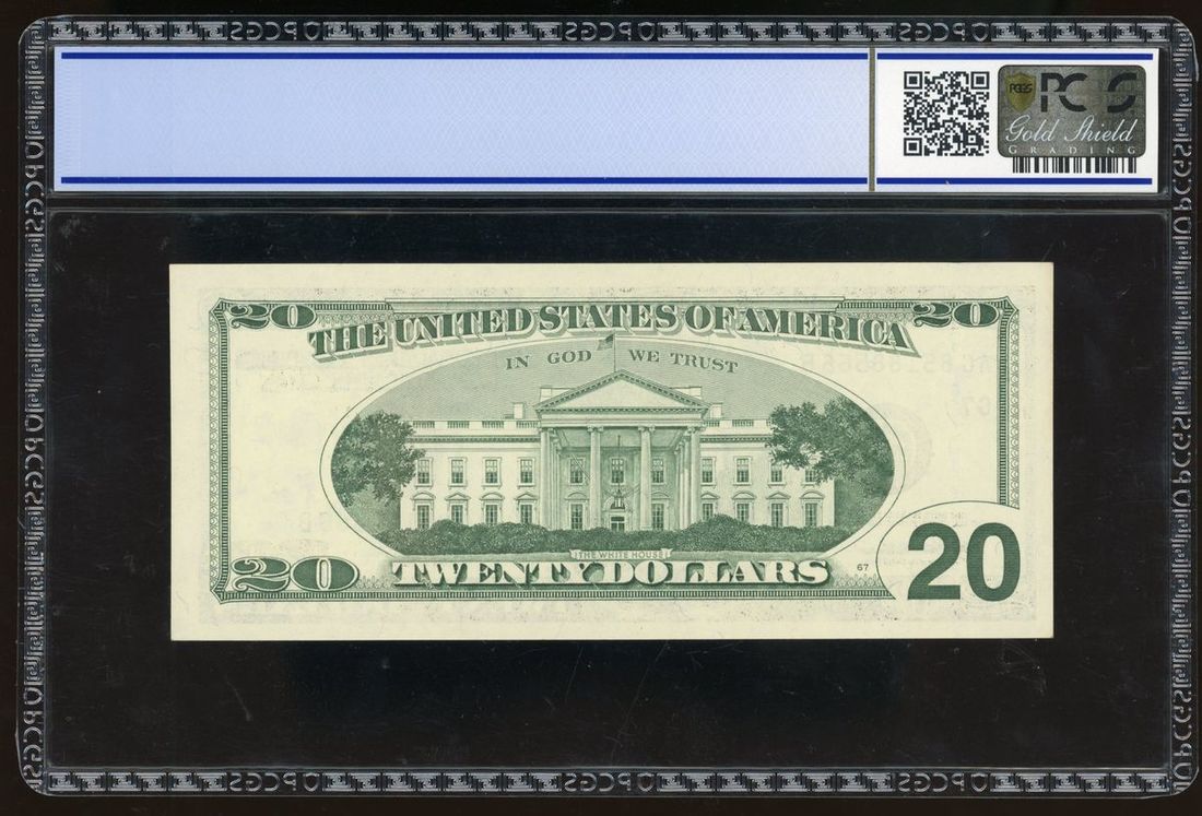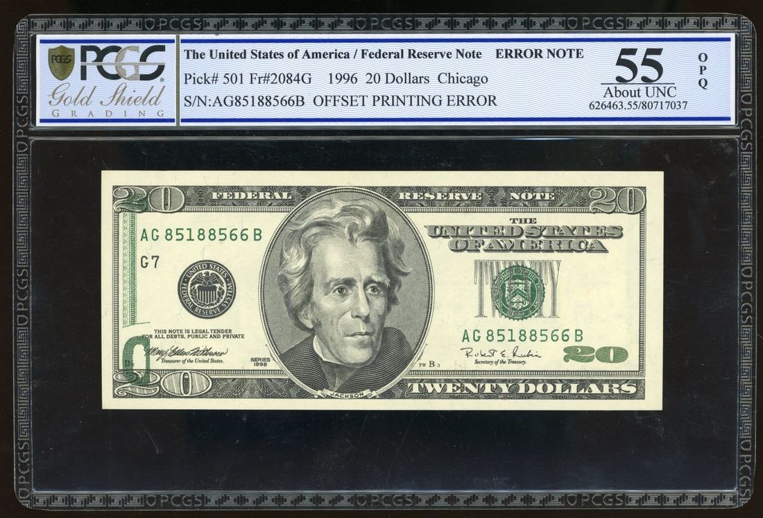 Federal Reserve Note, United States of America, ERROR $20, 1996, serial number AG85188566B, (Friedberg 2084G), PCGS 55OPQ. Reverse design offset printing on obverse