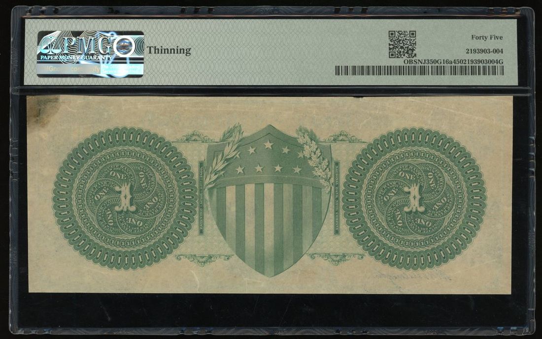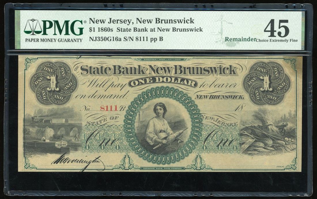 State Bank New Brunswick, $1, 1860s, remainder, serial number 8111, PMG 45, thinning.