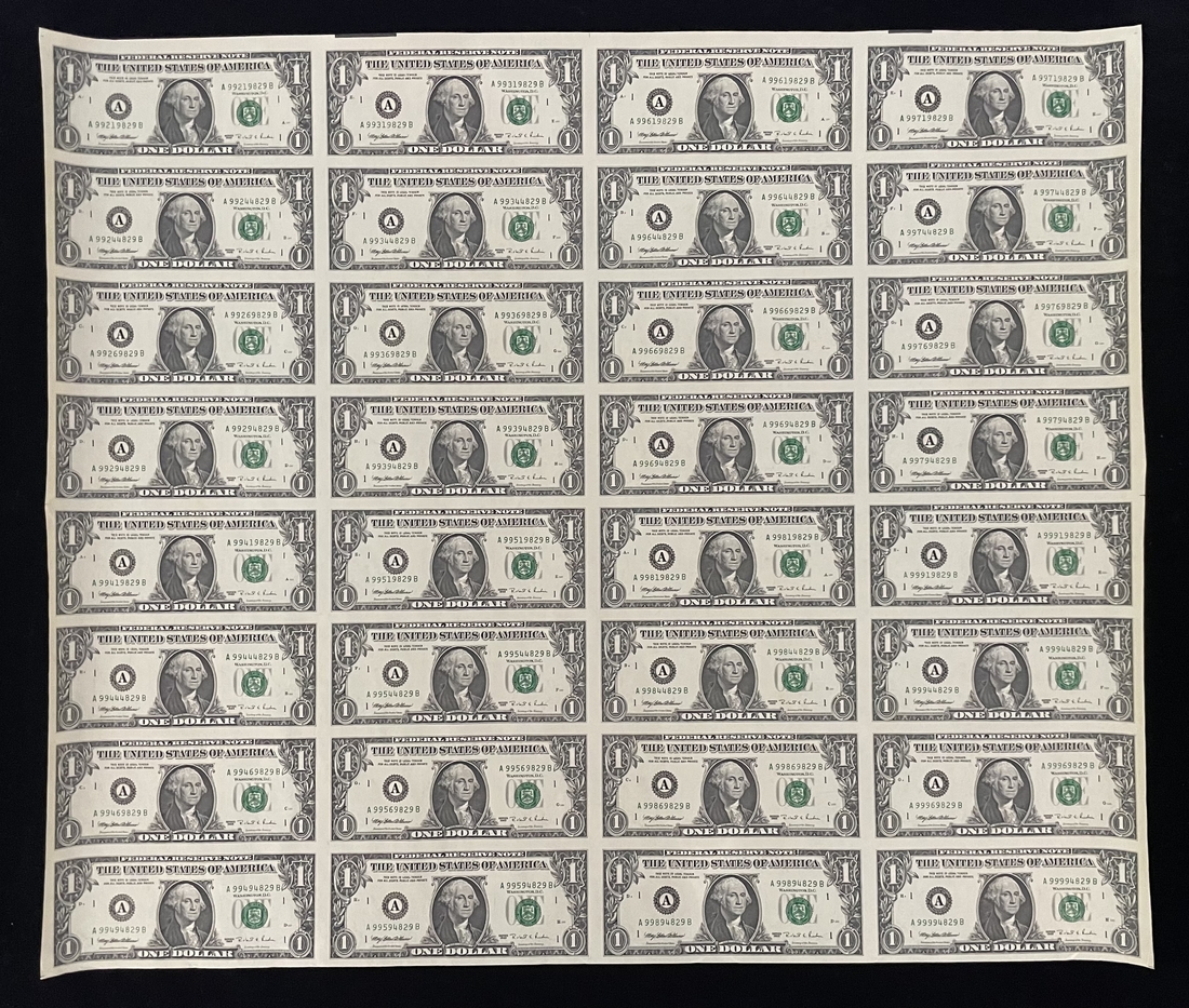 United States, an uncut sheet of 32x $1, 1995, Federal Reserve Note, Boston, signed by Withrow & Rubin,