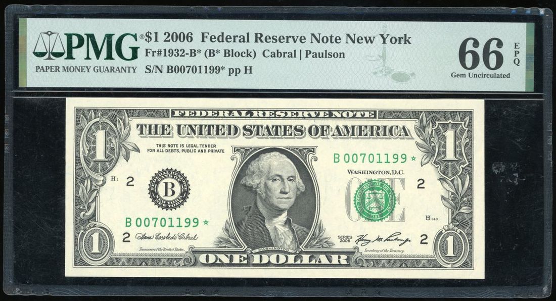 Federal Reserve Note New York, United States, replacement $1, 2006, serial number B00701199* pp H, signatures by Cabral and Paulson,