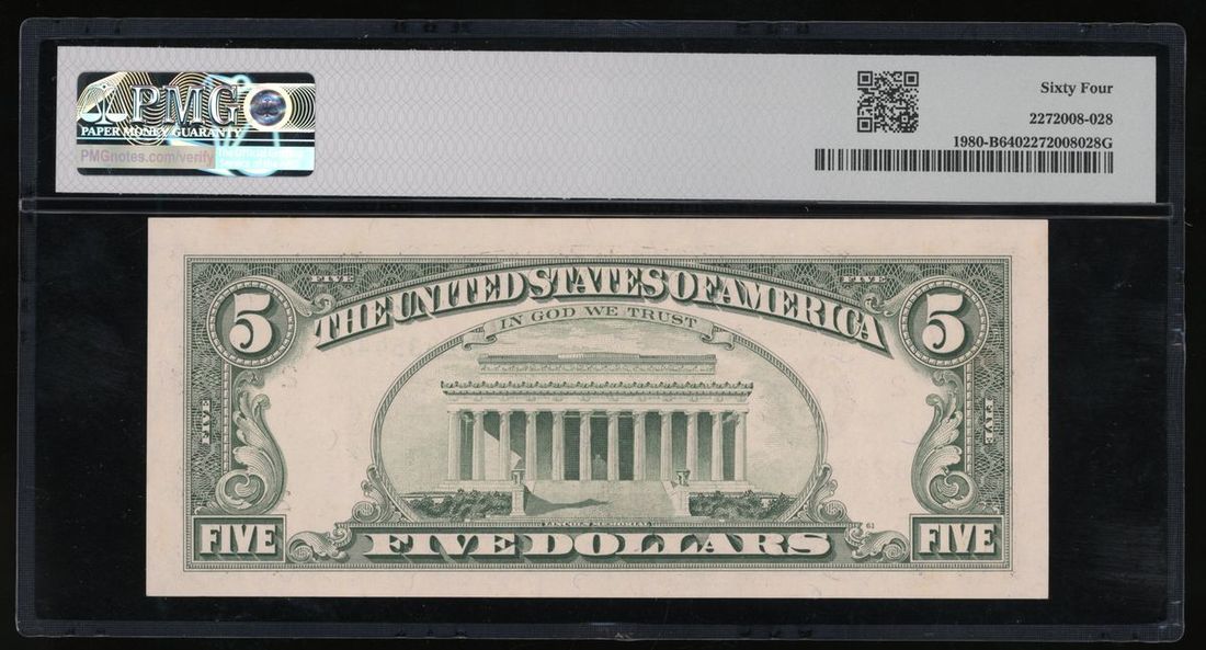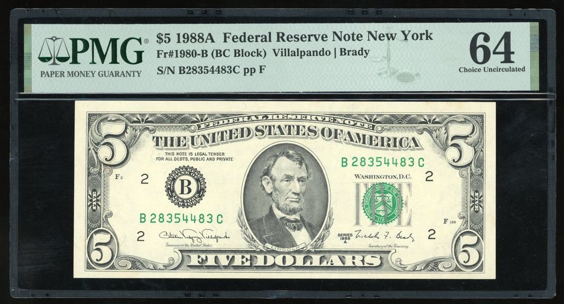 Federal Reserve Note New York, USA, $5, 1980B, serial number B28354483C,