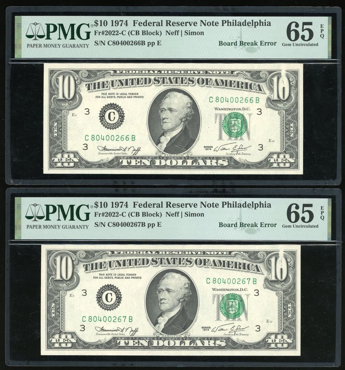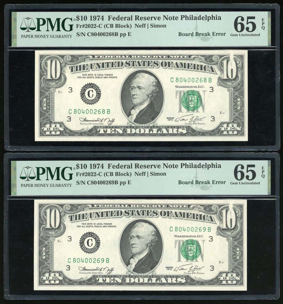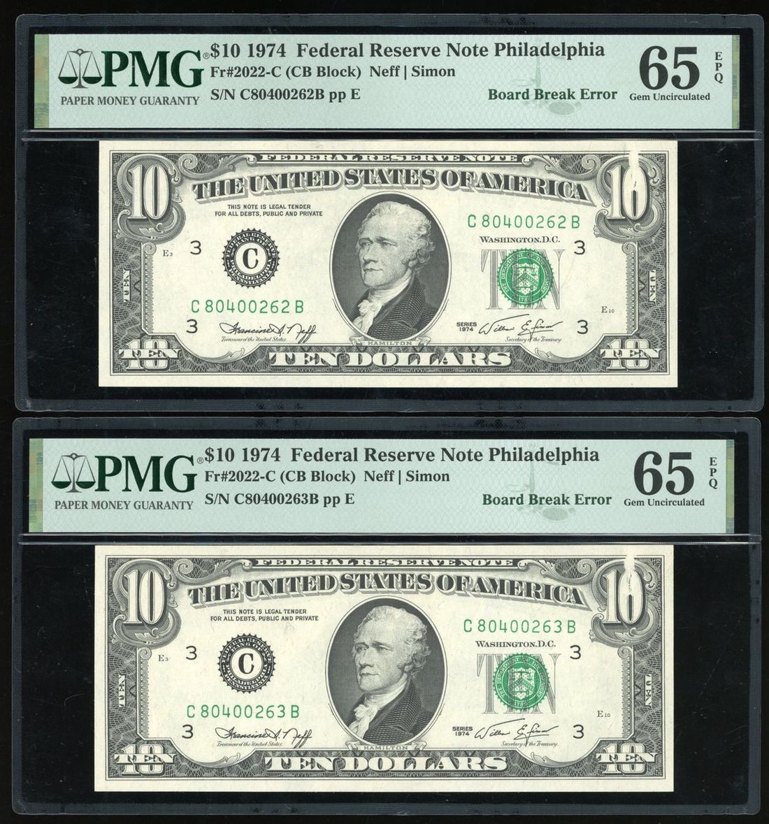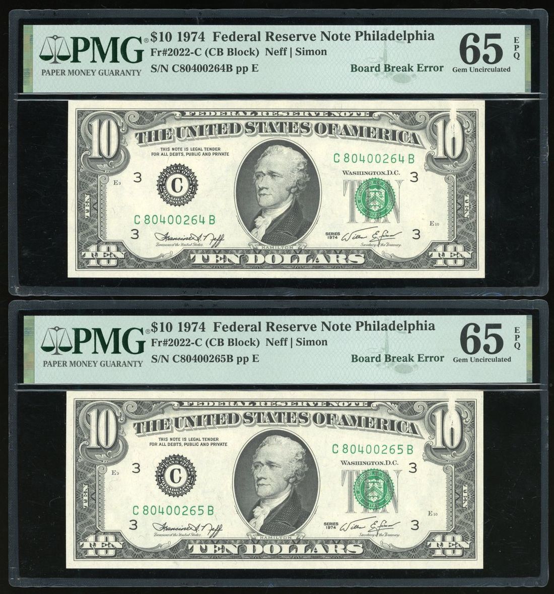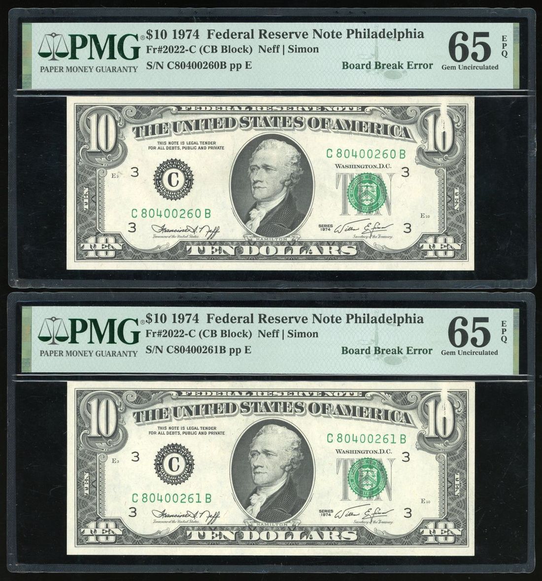 Federal Reserve Note, United States of America, consecutive ERROR $1 (10), 1974, serial numbers C80400260/1/2/3/4/5/6/7/8/9B, (Friedberg 2022-C), all PMG 65EPQ. All notes with same board break error at top right (10)