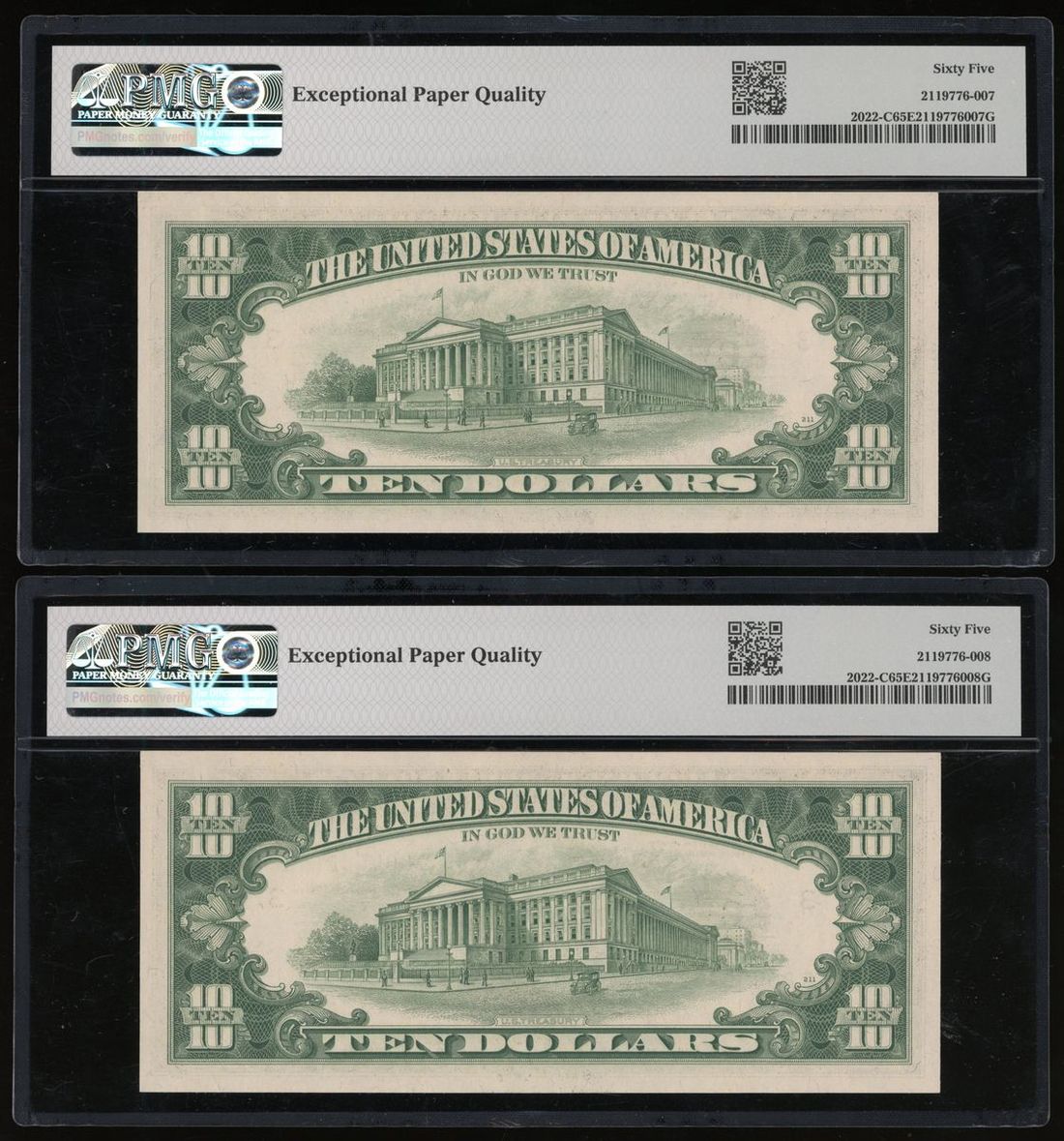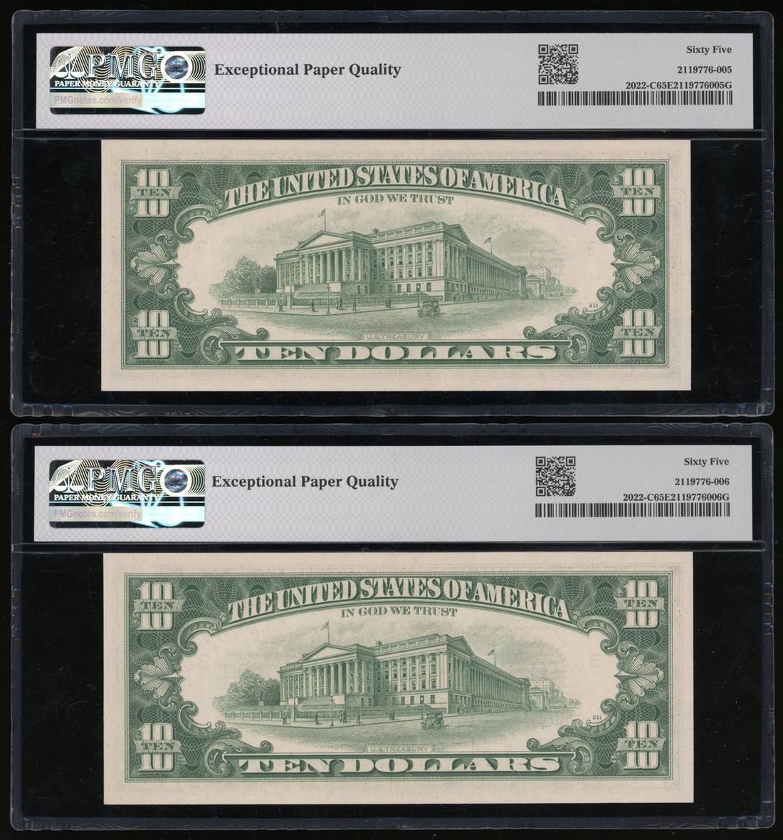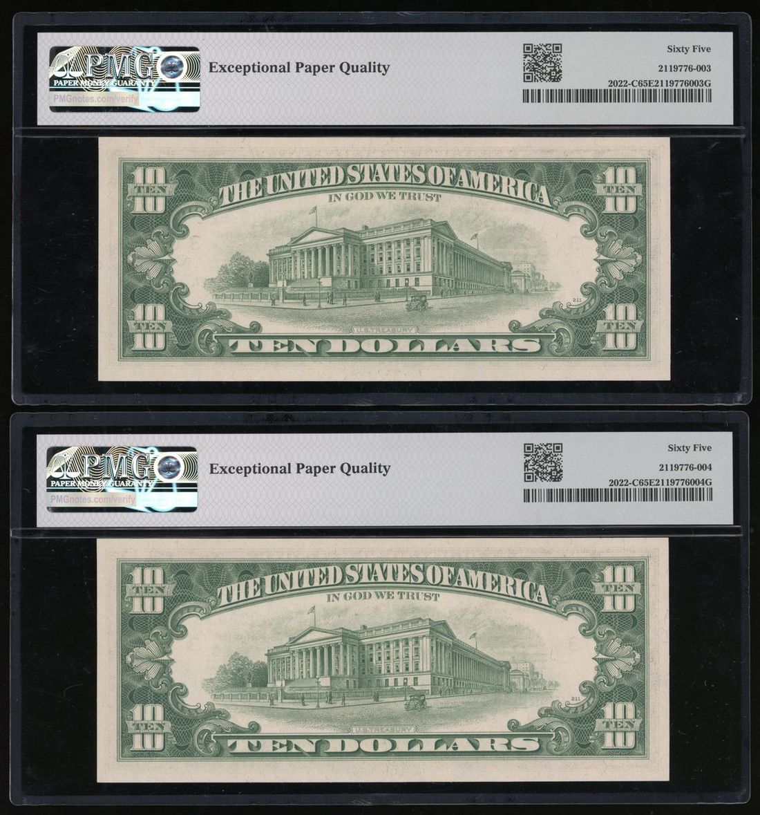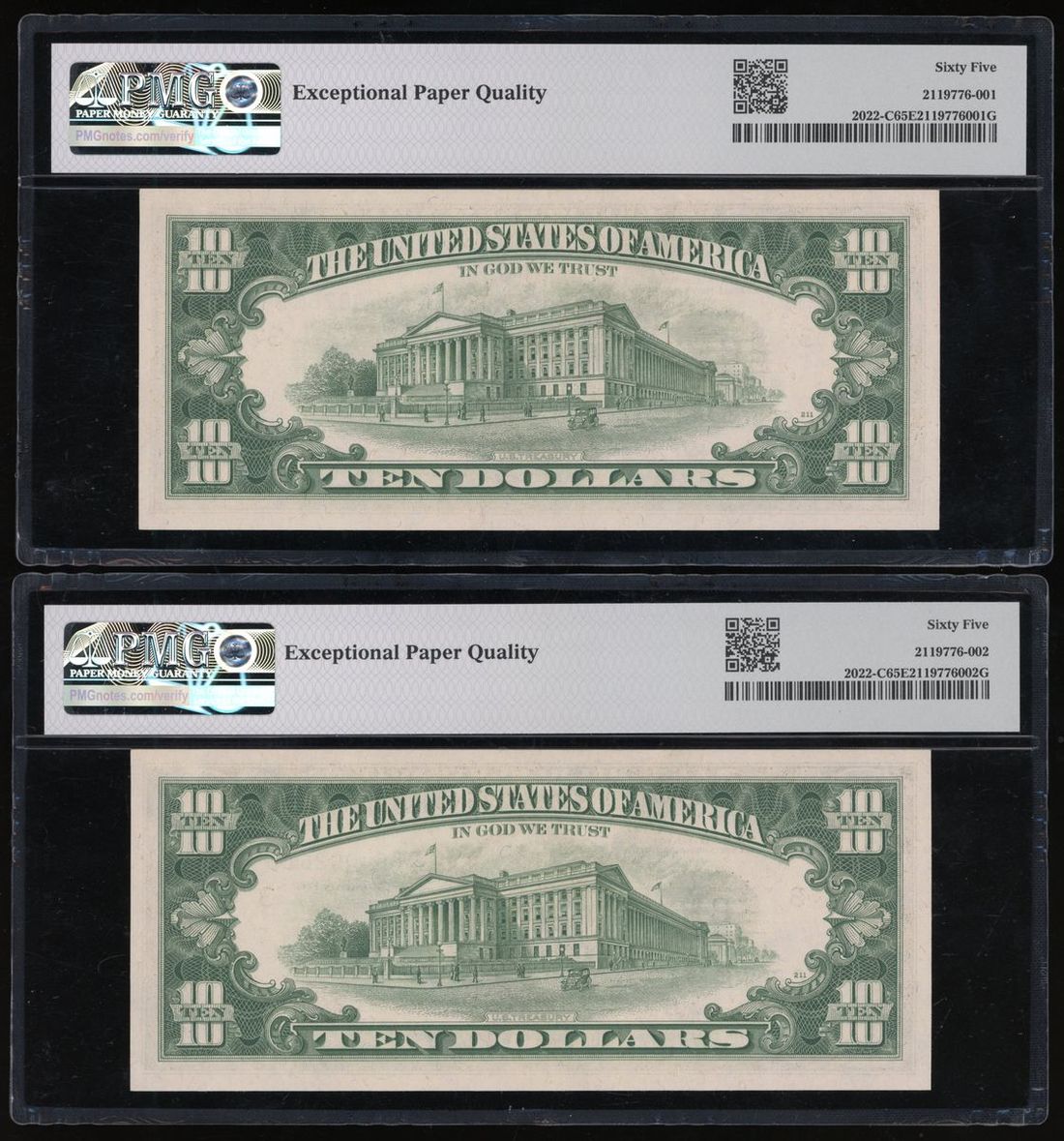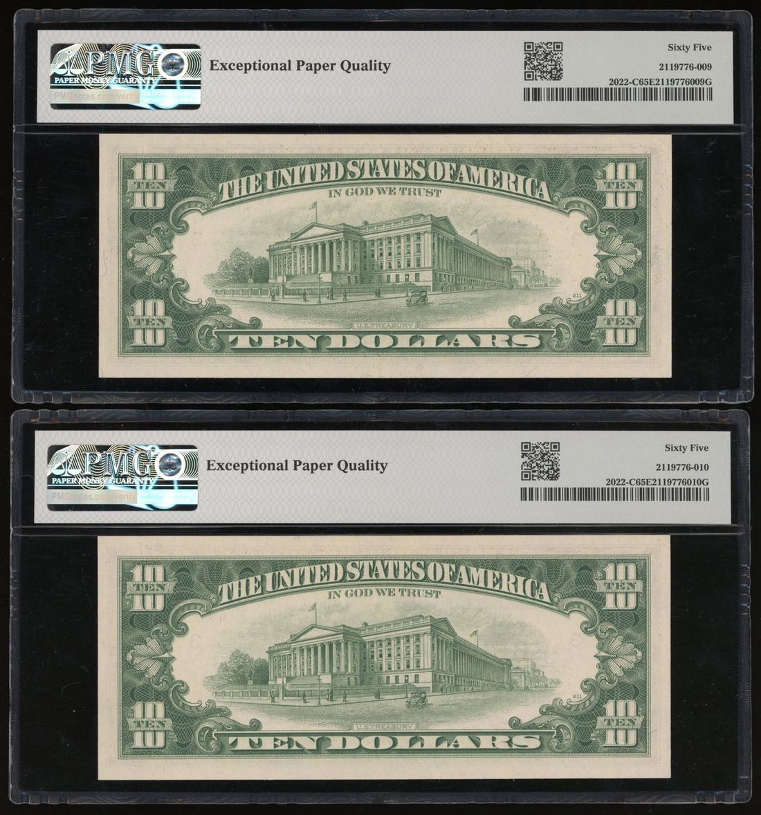 Federal Reserve Note, United States of America, consecutive ERROR $1 (10), 1974, serial numbers C80400260/1/2/3/4/5/6/7/8/9B, (Friedberg 2022-C), all PMG 65EPQ. All notes with same board break error at top right (10)