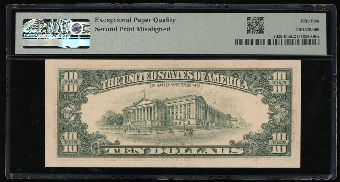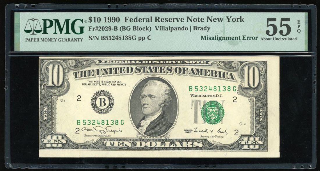 1990年美國10元錯體, 編號 B53248138G, 印刷移位錯體, PMG 55EPQ