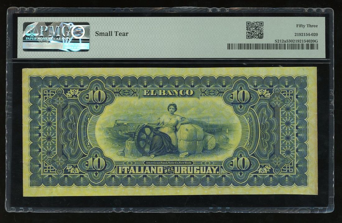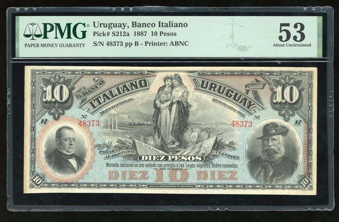 Banco Italiano, Uruguay, 10 pesos, 1887, serial number 48373, (Pick S212a), PMG 53, small tear